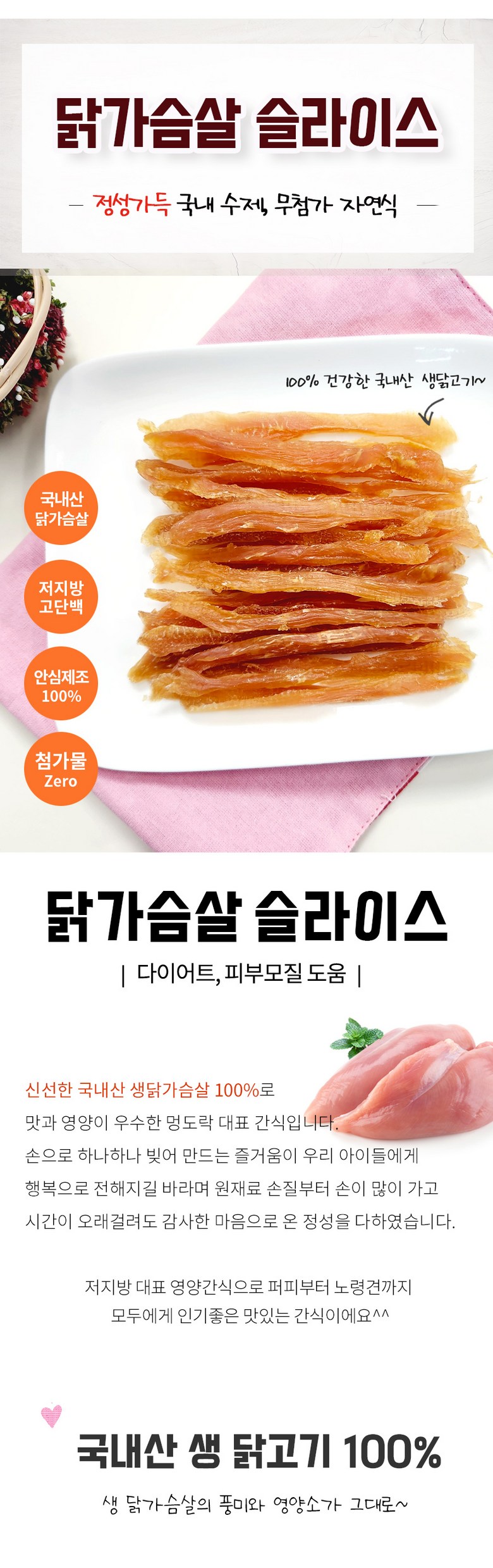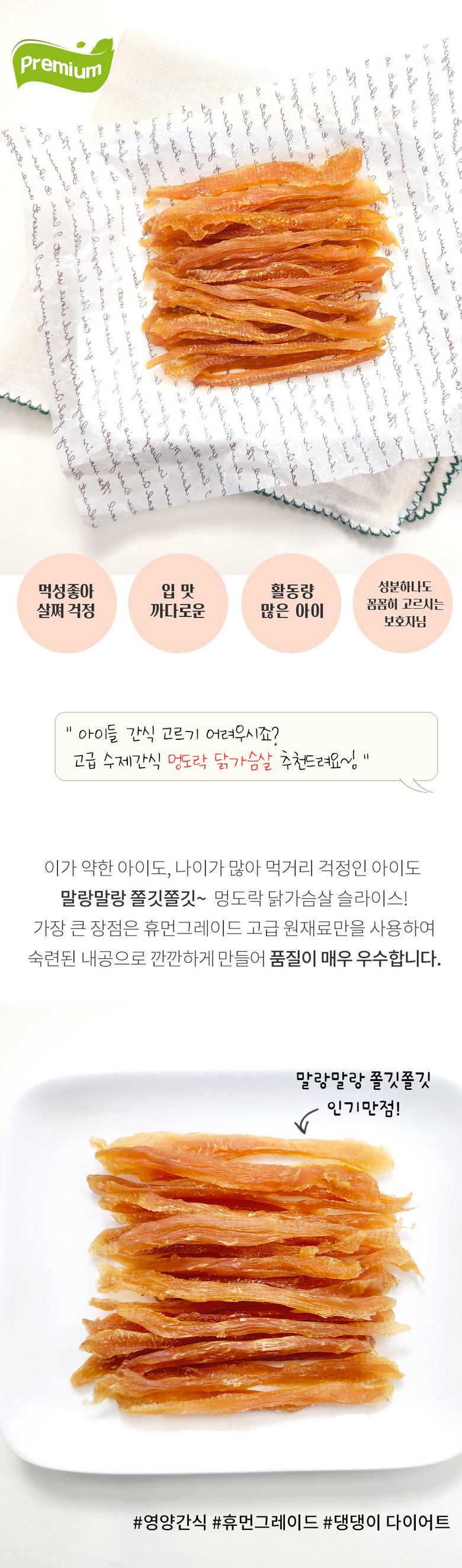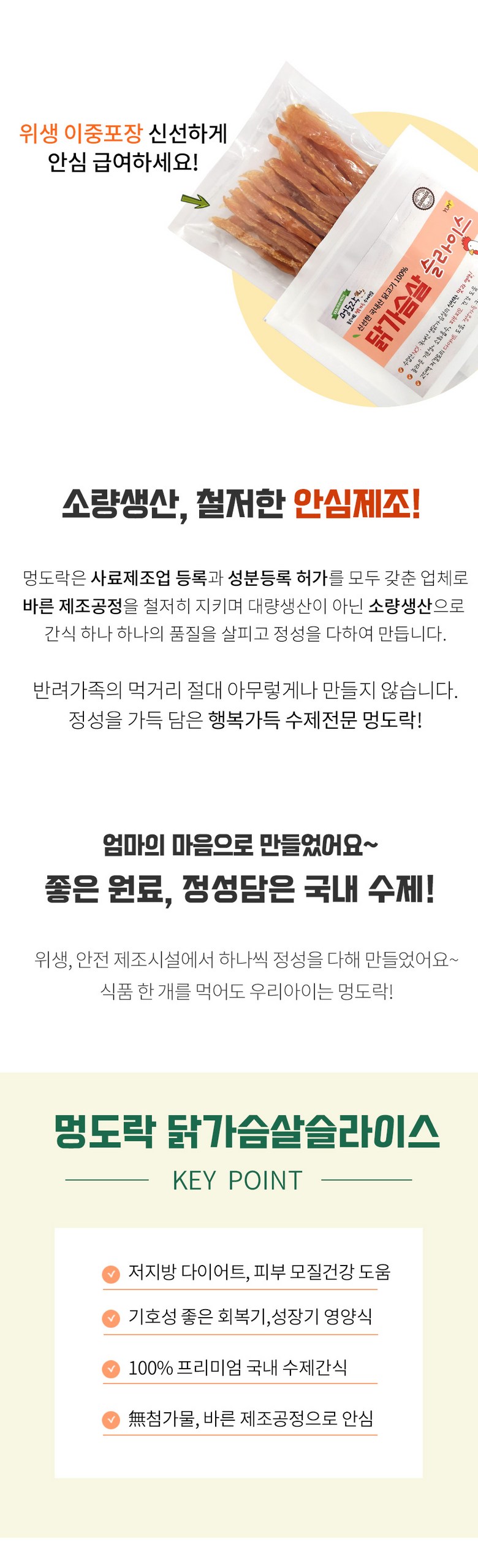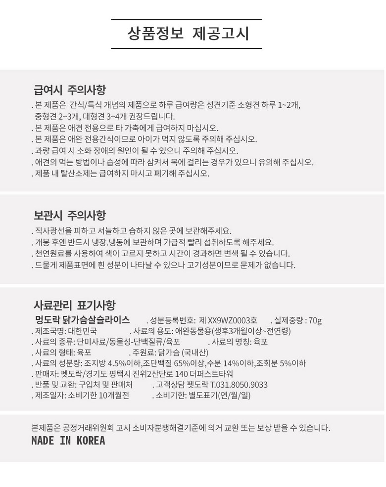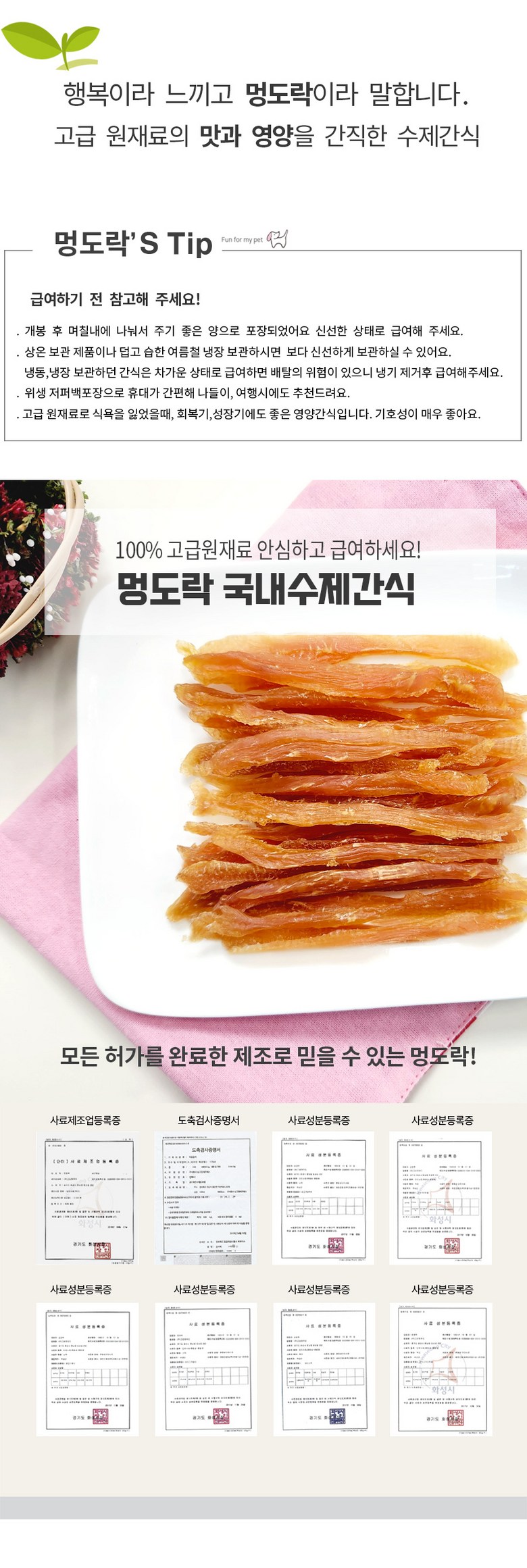 | 품명 및 모델명 | 멍도락 닭가슴살 국내산 수제간식 | 인증/허가 사항 | 상품 상세페이지 참조 |