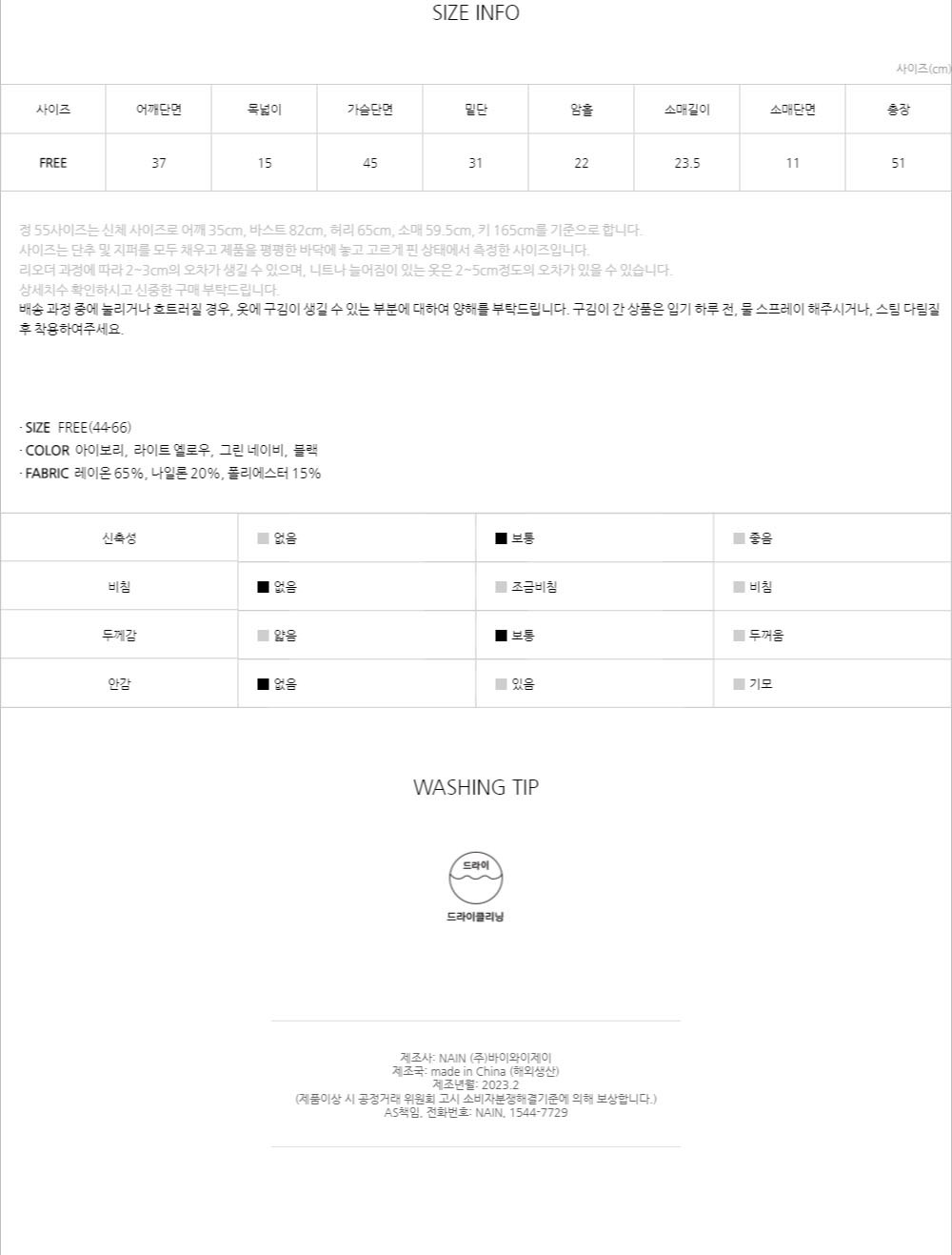 | 제조국 | 중국 | 세탁방법 및 취급시 주의사항 | 컨텐츠 참조 |