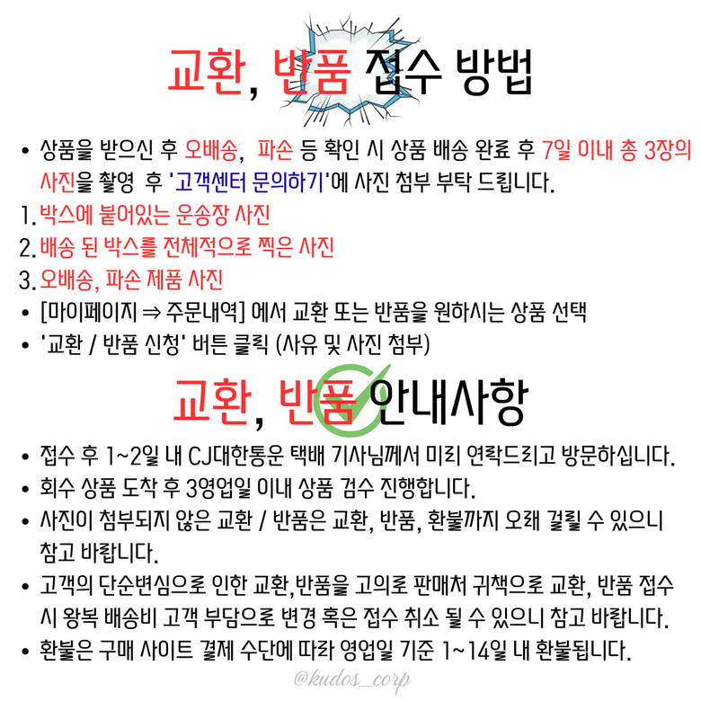 - ㆍ교환/반품에 관한 일반적인 사항은 판매자가 제시사항보다 관계법령이 우선합니다.