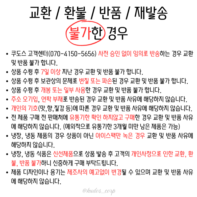 | 계절상품/식품/화장품 | ㆍ신선/냉장/냉동 상품의 단순변심의 경우 ㆍ뷰티 상품 이용 시 트러블(알러지, 붉은 반점, 가려움, 따가움)이 발생하는 경우, |