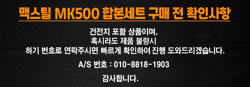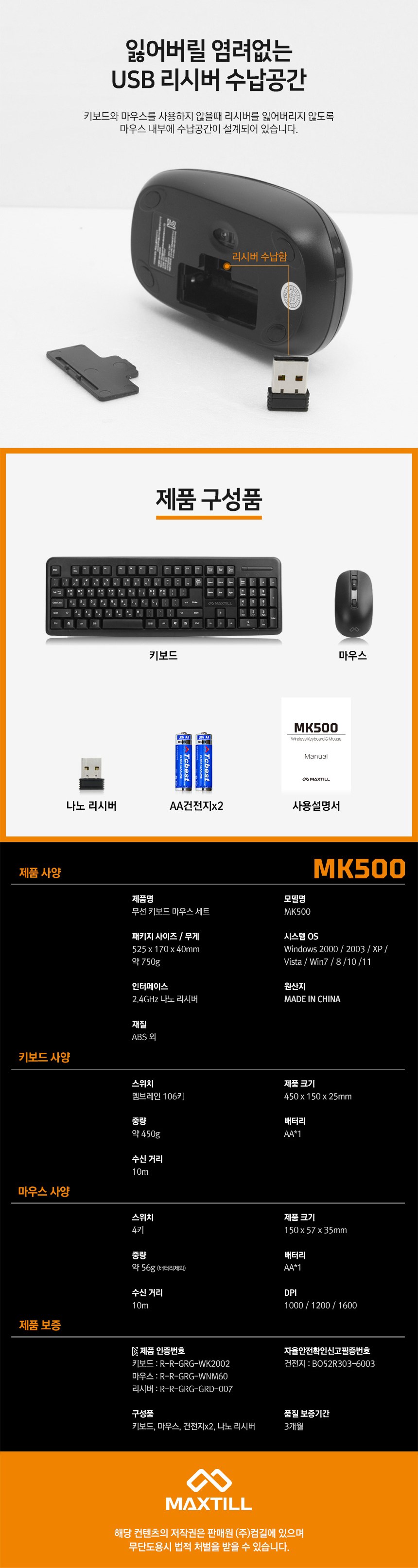 | 품명 및 모델명 | 맥스틸 무선 키보드 + 마우스 세트 / GM-MK500 | KC 인증정보 | 키보드: R-R-GRG-WK2002 | 마우스: R-R-GRG-WNM60 | 리시버: R-R-GRG-GRD-007 | 건전지: B052R303-6003 |