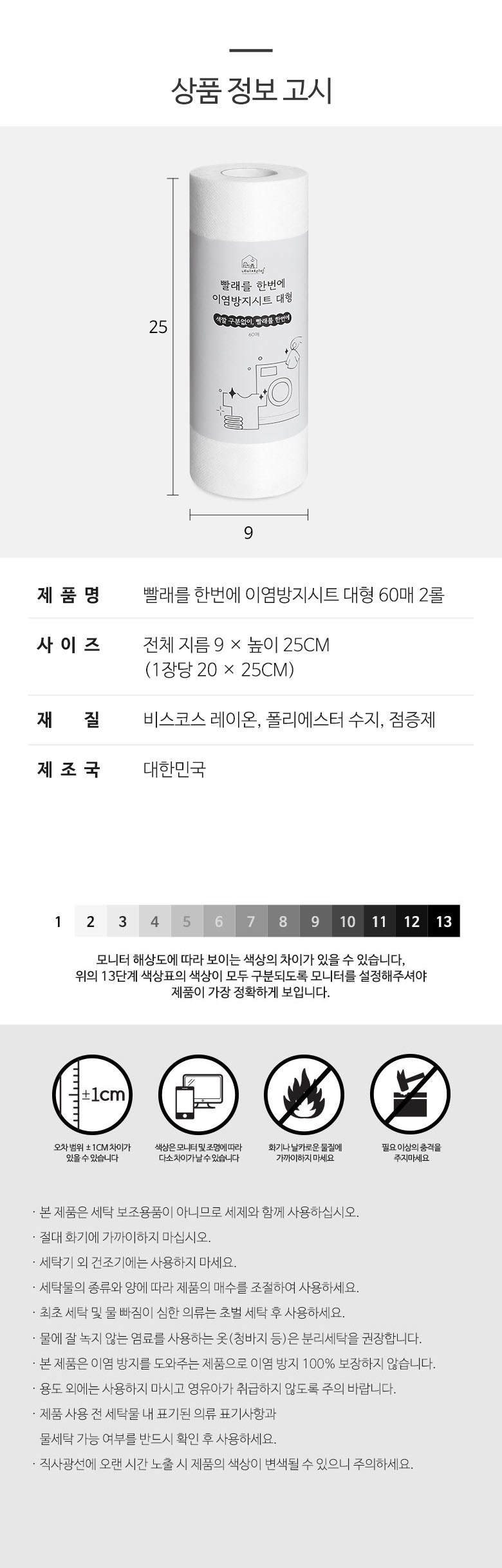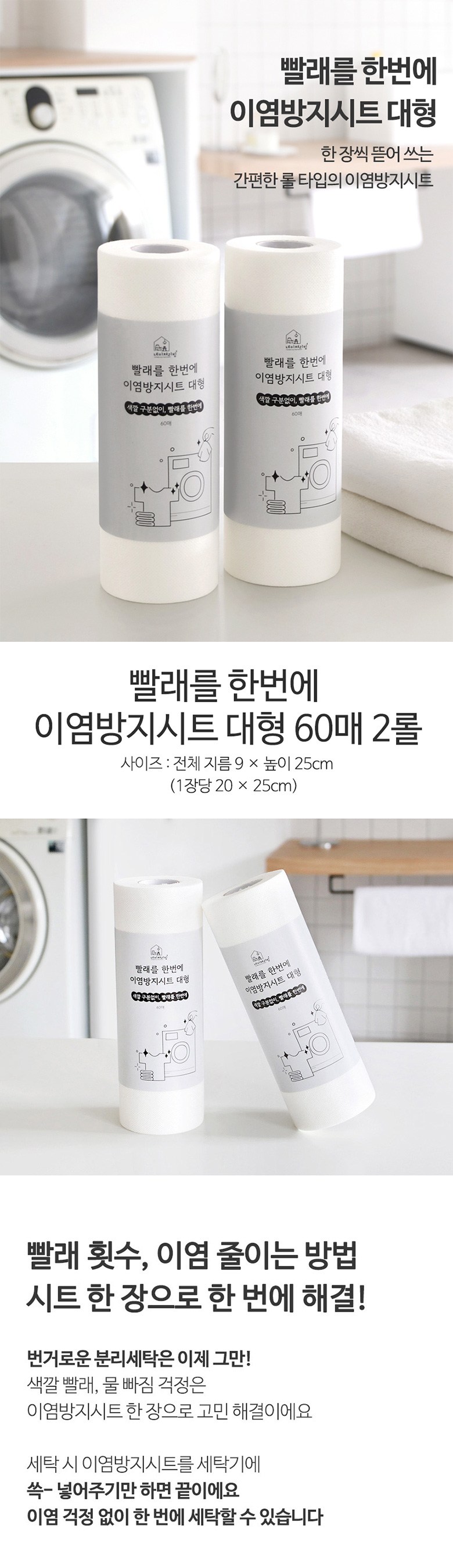 | 품명 및 모델명 | 빨래를 한번에 이염방지시트 대형 60매, 2롤 | 인증/허가 사항 | 해당없음 |