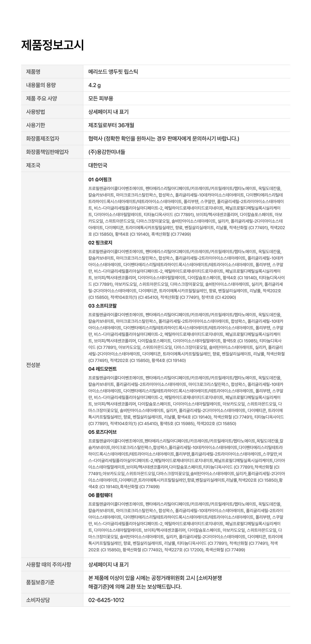 | 화장품제조업자, 화장품책임판매업자 및 맞춤형화장품판매업자 | 코스맥스(주) / (주)용감한미녀들 | 제조국 | 컨텐츠 참조 |
