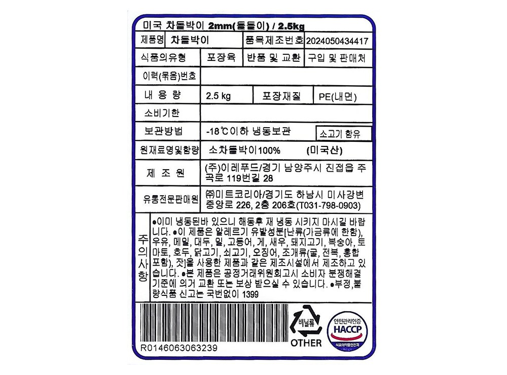 | 제조연월일, 소비기한 또는 품질유지기한 | 소비기한(또는 유통기한) : 2027년 02월 05일 이거나 그 이후인 상품 제조년월일 : 2026년 02월 06일 이후인 제조상품 | 세부 품목군별 표시사항 | 축산물 등급표시 : 해당 없음 / 이력번호 표시유무 : 이력번호 표시제품임 |