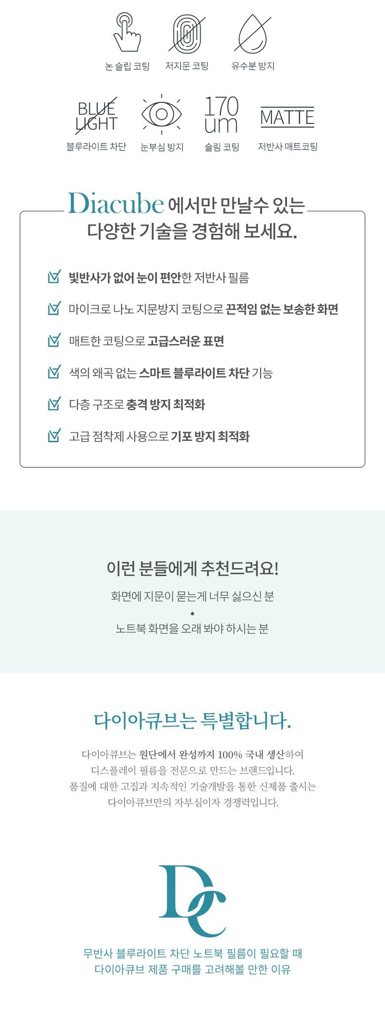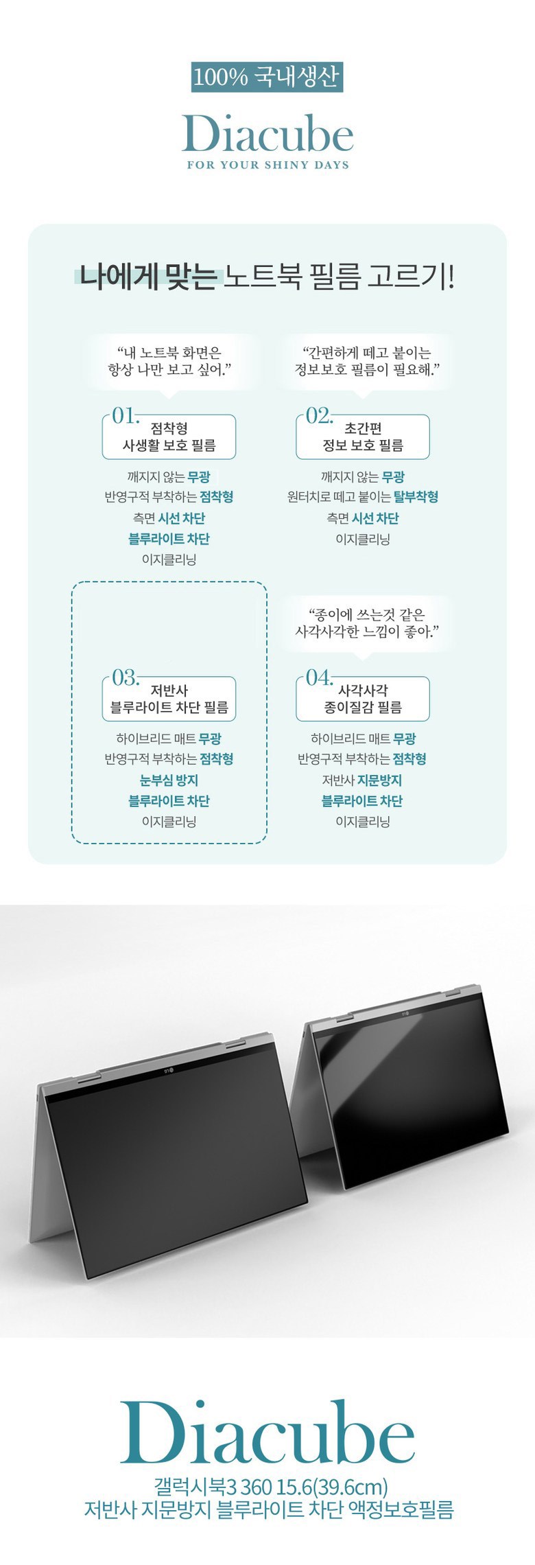| 품명 및 모델명 | 다이아큐브 갤럭시북3 360 15.6(39.6cm) 저반사 지문방지 종이질감 블루라이트차단 보호필름 | 인증/허가 사항 | 본품 : 해당 없음, 알코올패드 : HB20-02-0189 (2020-12-03~2023-12-02) |