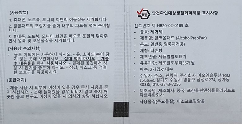 | 제조국(원산지) | 대한민국 | 제조자(수입자) | 본품 : 이오엠솔루션, 알코올패드 : 컨텐츠참조/컨텐츠참조(제조국:중국) |