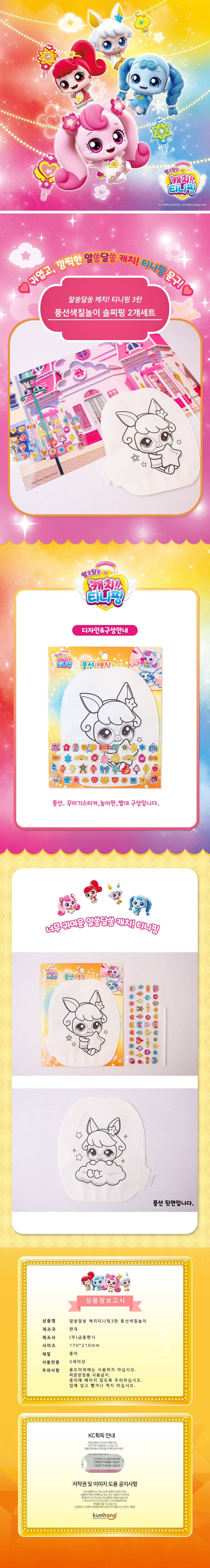 | 품명 및 모델명 | 알쏭달쏭 캐치티니핑3탄 풍선 색칠놀이 솔찌핑 | KC 인증정보 | CB067H088-2001, CB067H049-0002 |