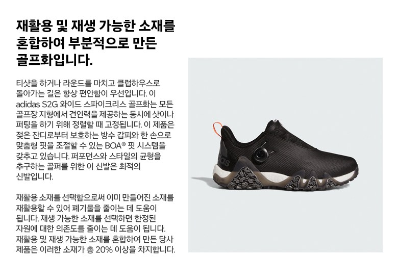 | 제조국 | 중국 | 취급시 주의사항 | (1) 골프 이외의 용도로는 사용하지 마십시오. 골프 전용으로 만들어진 제품이오니 골프장 이외의 장소나 다른 스포츠 용도로 사용하는 것은 삼가하십시오. (2) 적합한 치수의 제품을 선택 하십시오. 최상의 차굥감과 안전을 위하여 사용자 본인의 발 모양과 길이에 맞는 제품을 직접 신어보고 사용하십시오. (3) 착용 전 클릿(스파이크)을 확인 하십시오. 안전한 착용을 위하여 사용 전에 헐거워진 클릿은 사용법에 맞게 조여 주십시오. 클릿이 닳았을 경우 경기력에 영향을 미칠 수 있으며 안전상의 문제가 발생할 수 있으므로 아디다스 전용 클릿으로 교체하십시오. 부주의한 사용은 파손될 우려가 있으니 올바른 클릿 사용법을 숙지하십시오. (4) 올바른 방식으로 착용하십시오. 구두 주걱을 이용하여 착용하시고 신발끈은 느슨하지 않게 단단히 묶어쥡시오. 뒤꿈치를 꺽어 신을 경우 제품의 변형이나 파손의 원인이 됩니다. (5) 보행 시 충분히 주의하십시오. 골프화의 특성상 바닥의 상태에 따라 걸려 넘어지거나 미끄러질 수 있으니 보행시 충분한 주의를 기울이십시오. ※주의해야 될 장소 급경사, 젖은 고무 매트, 젖어 있거나 얼어 붙어 있는 장소, 지면이 딱딱한 장소, 울퉁불퉁하거나 낙엽이 쌓인 장소 (6) 발이 불편할 경우 착용하지 마십시오. 통증이 느껴지거나 기타 이상이 나타날 경우 착용을 중단하십시오. |