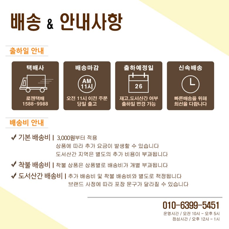| 배송방법 | 순차배송 | 배송비 | 무료배송 · 도서산간 추가 배송비 - 제주 지역: 3,500원 - 도서산간 지역: 3,500원 |