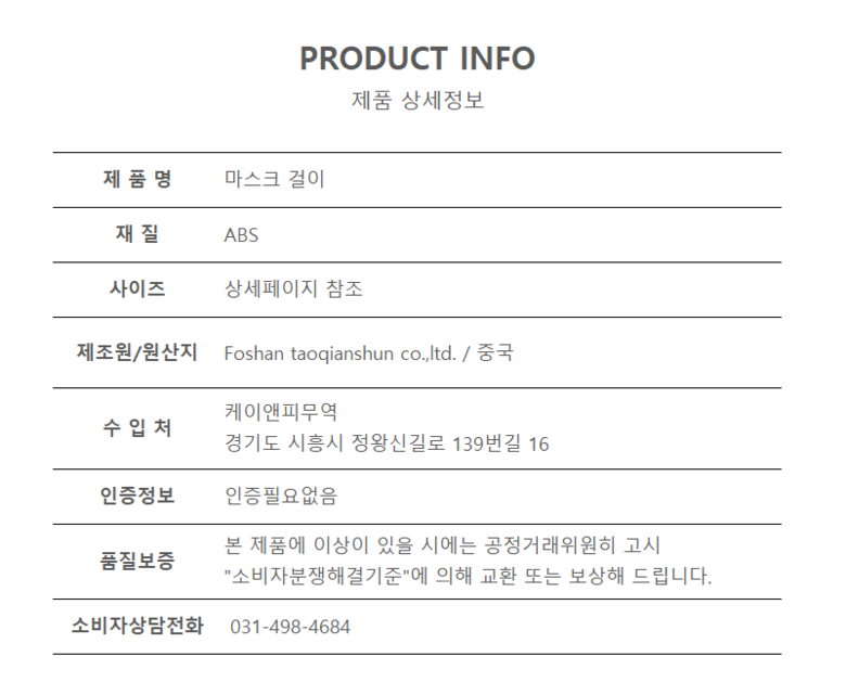 | 품명 및 모델명 | 차량용 마스크 멀티 걸이 | 인증/허가 사항 | 해당없음 |