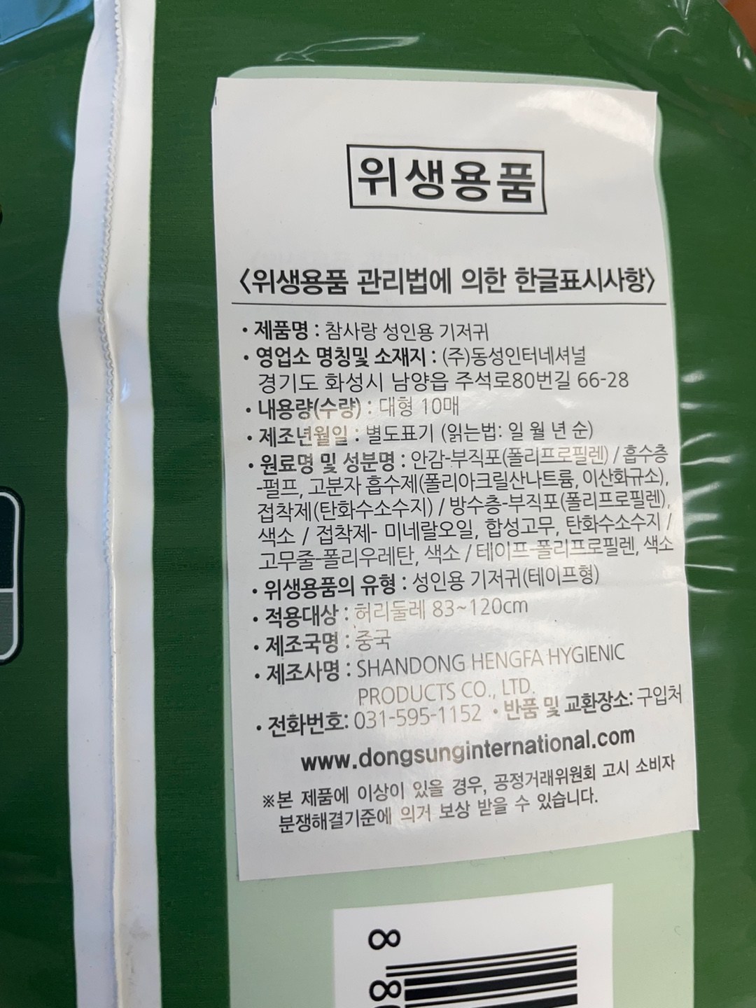 | 제조국(원산지) | 중국 | 제조자(수입자) | SHANDONG HENGFA HYGIENIC PRODUCTS CO.LTD / (주)동성인터네셔널 |