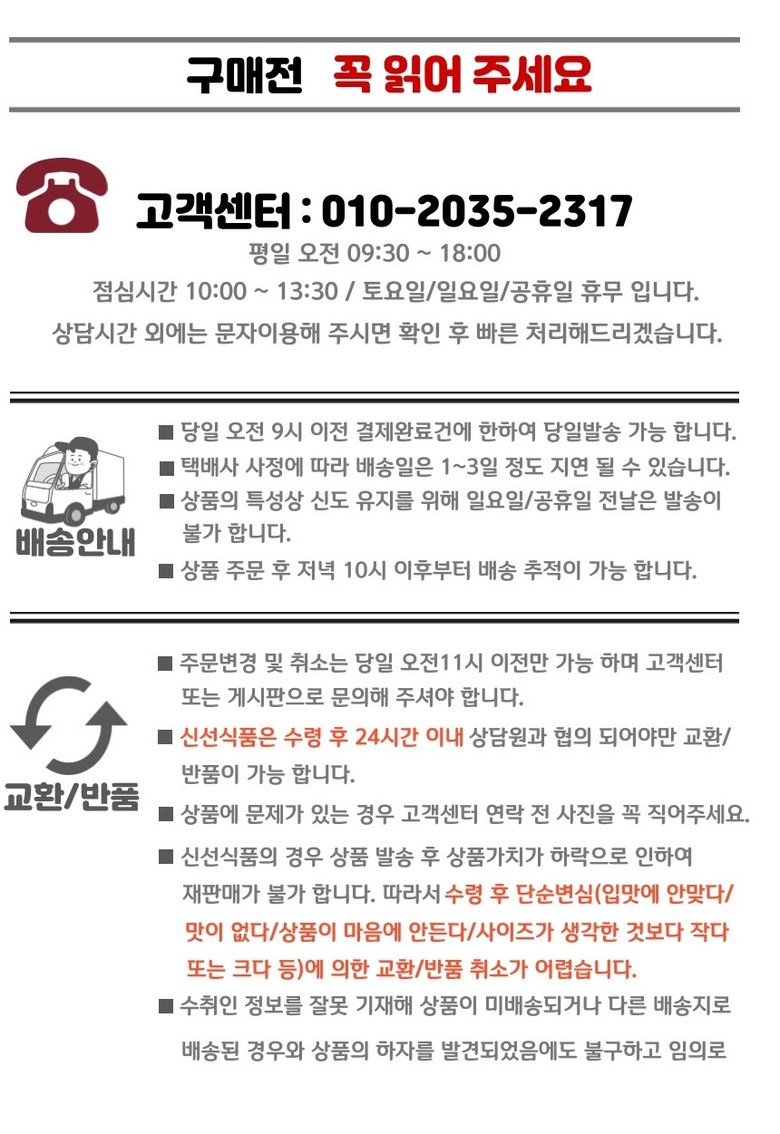 | 배송방법 | 신선/냉장/냉동 | 배송비 | 무료배송 - 도서산간 지역 배송불가 |