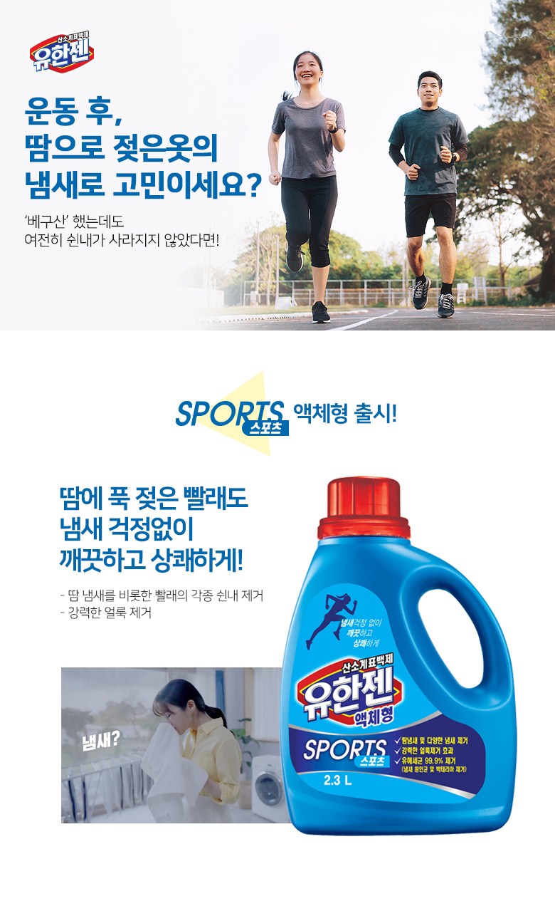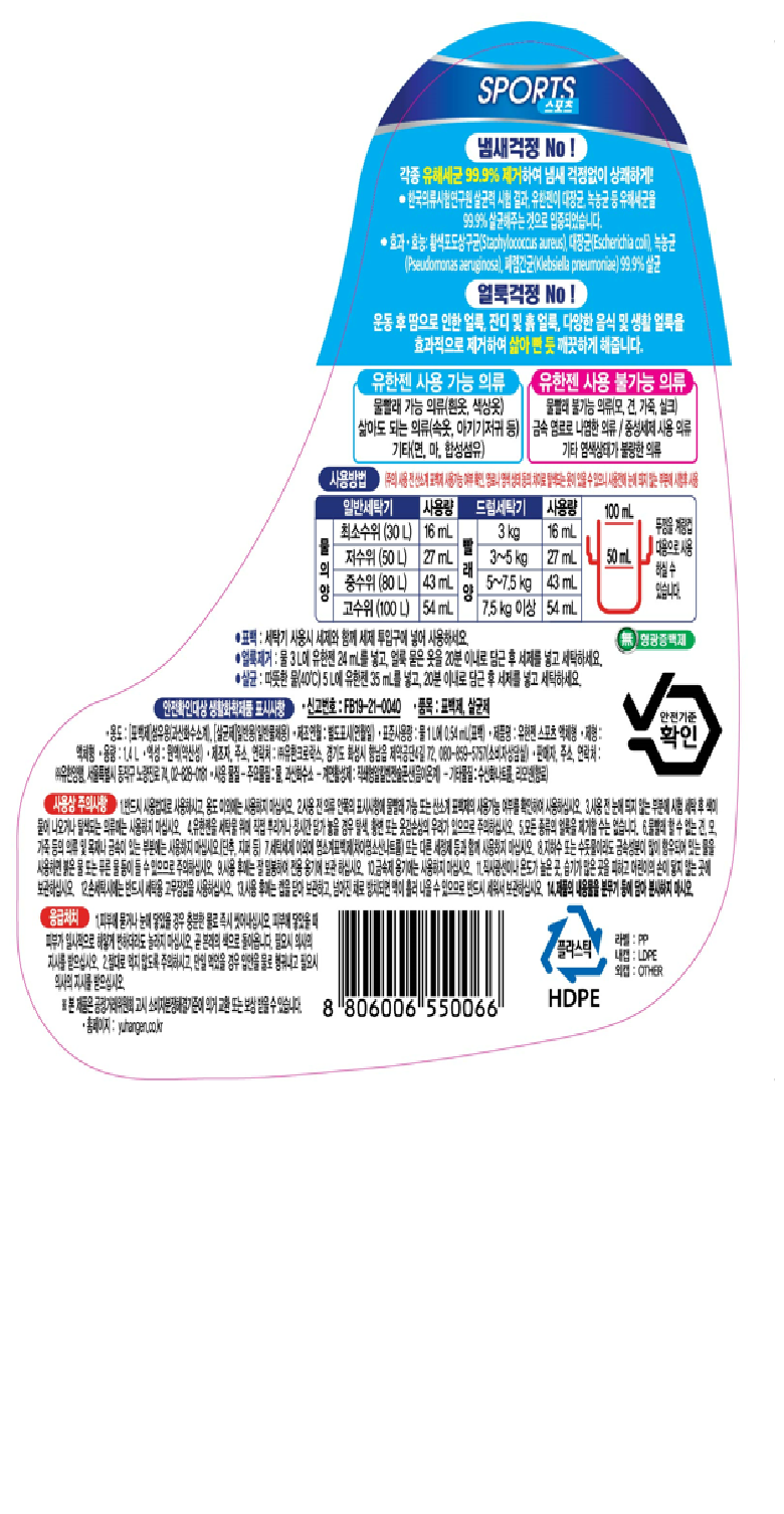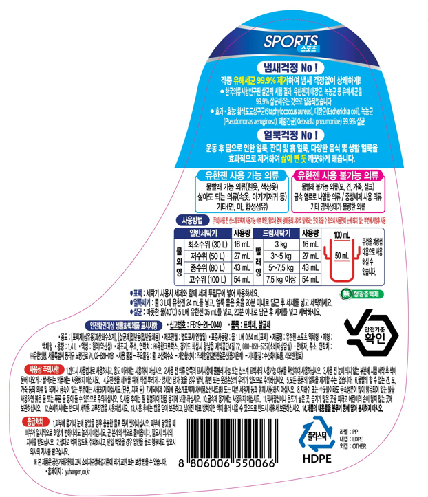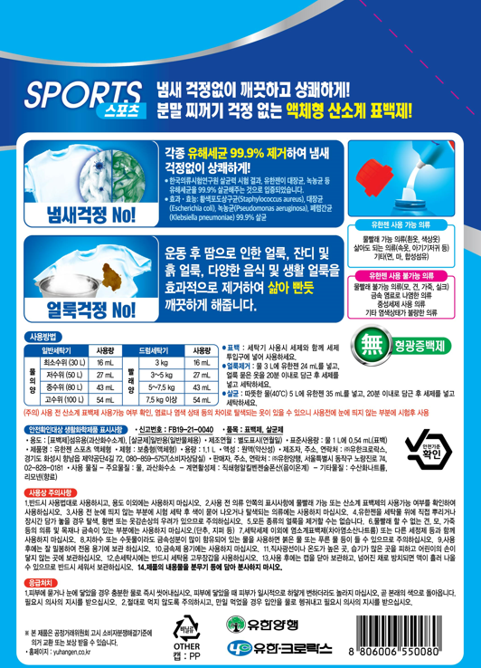 | 품목 및 제품명 | 살균제,표백제/유한젠 스포츠 액체형 | 용도(표백제의 경우 계열을 함께표시) 및 제형 | 일반용-일반물체용,섬유용-과산화수소계/비분사형-액체형 |