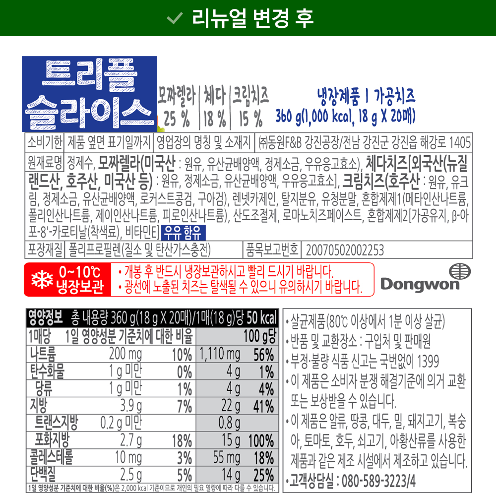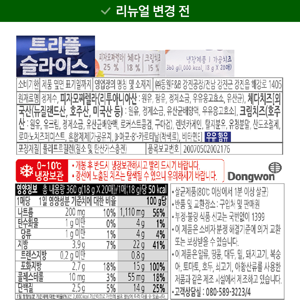| 제품명 | 리뉴얼전: 트리플 슬라이스 / 리뉴얼후: 소와나무 트리플 슬라이스 | 식품의 유형 | 컨텐츠 참조 |