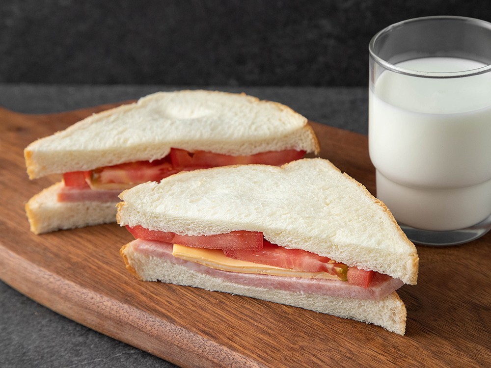 재료: 식빵 2장, 트리플 슬라이스 1장, 햄 2장, 모차렐라 치즈 40g, 버터 1큰술, 마요네즈 1큰술, 슬라이스 토마토