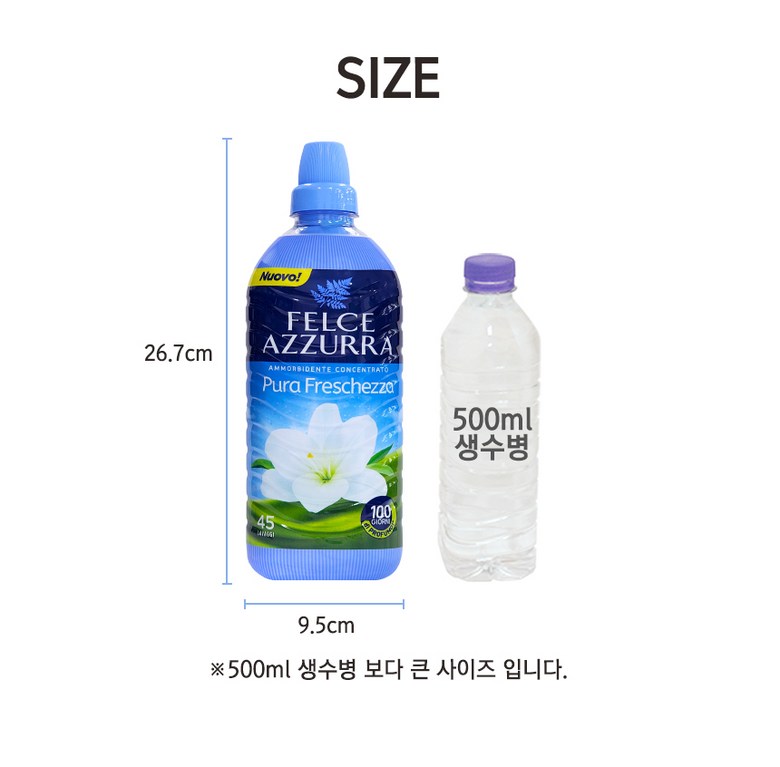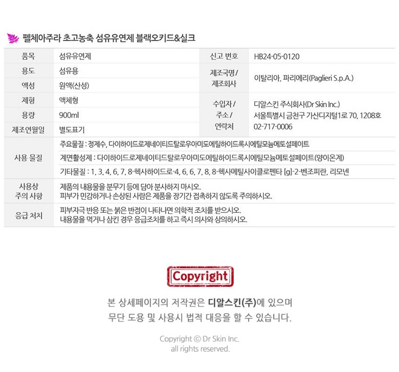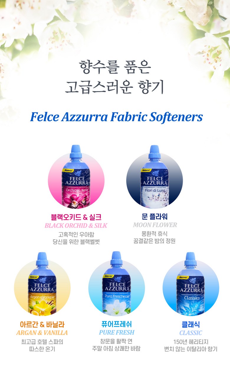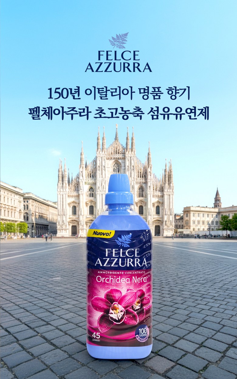 | 품목 및 제품명 | 펠체아주라 향좋은 고농축 섬유유연제 900mL 블랙오키드&실크 1개입 이탈리아 직수입 | 용도(표백제의 경우 계열을 함께표시) 및 제형 | 섬유용 / 액체형 |