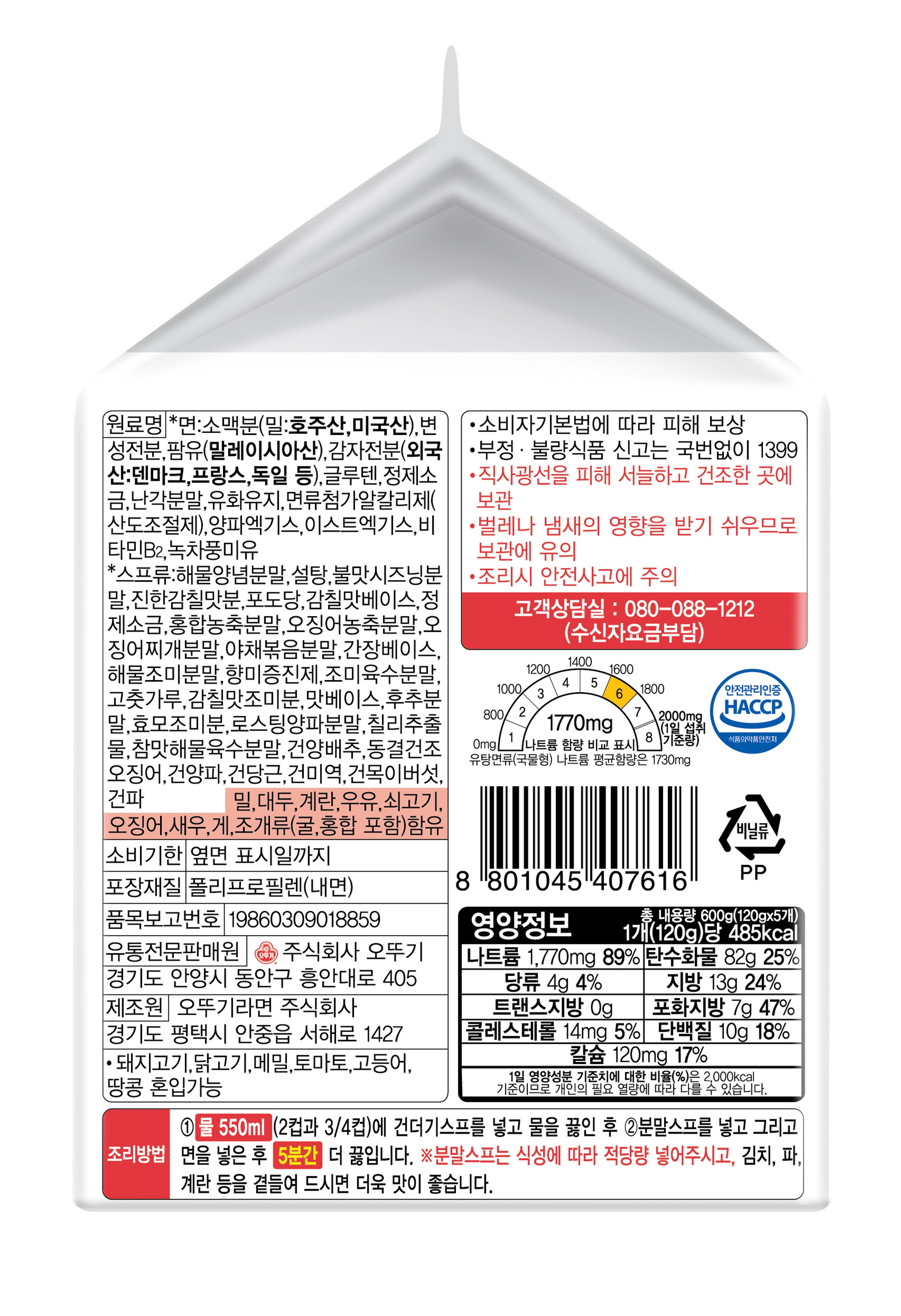 | 제품명 | 오뚜기 해물짬뽕 | 식품의 유형 | 유탕면 |
