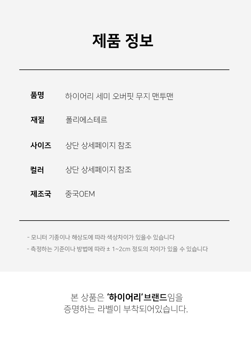 | 치수 | 컨텐츠 참조 | 제조자(수입자) | 하이어리협력업체 (정확한 제조사 또는 수입사 정보 업체 미제공) |