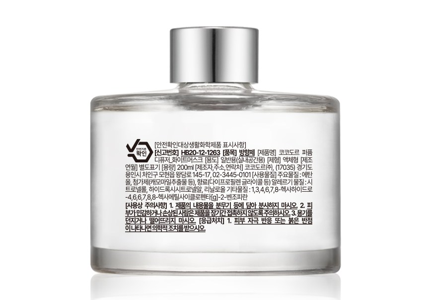 | 품목 및 제품명 | 방향제 / 코코도르 디퓨저_화이트머스크 | 용도(표백제의 경우 계열을 함께표시) 및 제형 | 일반용-실내공간용 / 비분사형-액체형 |