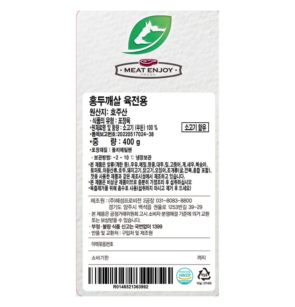 | 품목 또는 명칭 | 홍두깨살 육전용 | 포장단위별 내용물의 용량(중량),수량,크기 | 400g |