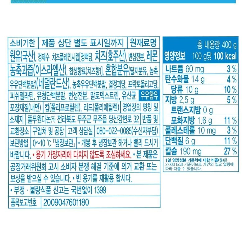 | 생산자 및 소재지 | 상품 상세페이지 참조 | 제조연월일, 소비기한 또는 품질유지기한 | 상품 상세페이지 참조 |