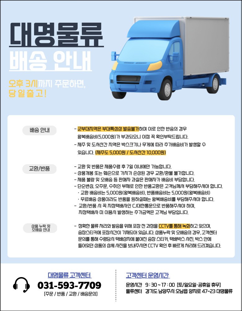 - ㆍ모니터 해상도의 차이로 인해 색상이나 이미지가 실제와 달라, 고객이 단순 변심으로 교환/반품을 무료로 요청하는 경우