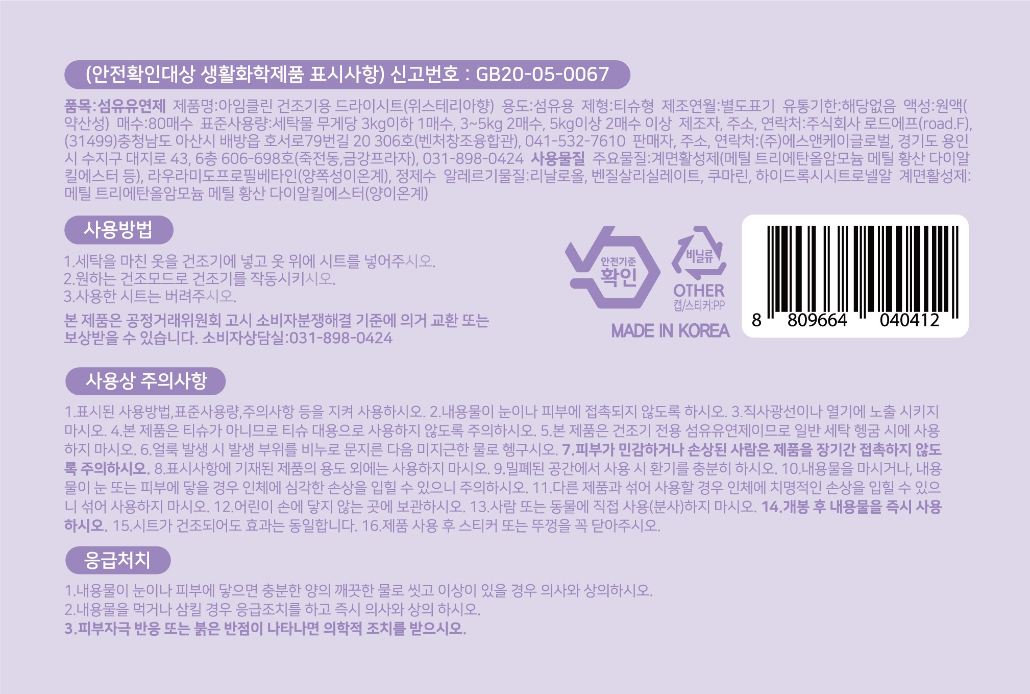 | 품목 및 제품명 | 섬유유연제 / 아임클린 건조기용 드라이시트(위스테리아향) | 용도(표백제의 경우 계열을 함께표시) 및 제형 | 섬유용 / 티슈형 |