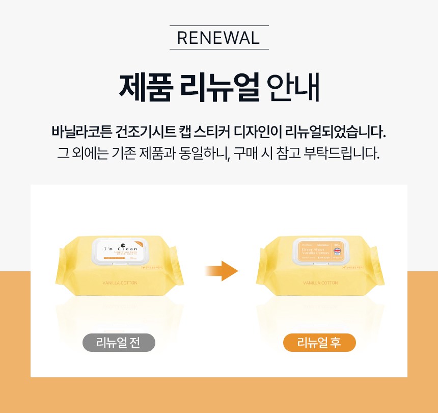 | 품목 및 제품명 | 섬유유연제 / 아임클린 건조기용 드라이시트(바닐라코튼향) | 용도(표백제의 경우 계열을 함께표시) 및 제형 | 섬유용 / 티슈형 |