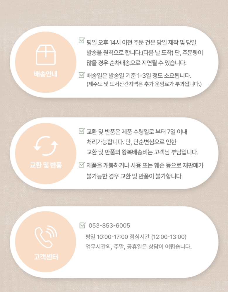 | 교환/반품 비용 (왕복비용) | 6,000원 - 단, 고객 변심의 경우에만 발생 - 도서산간 지역 배송불가 |