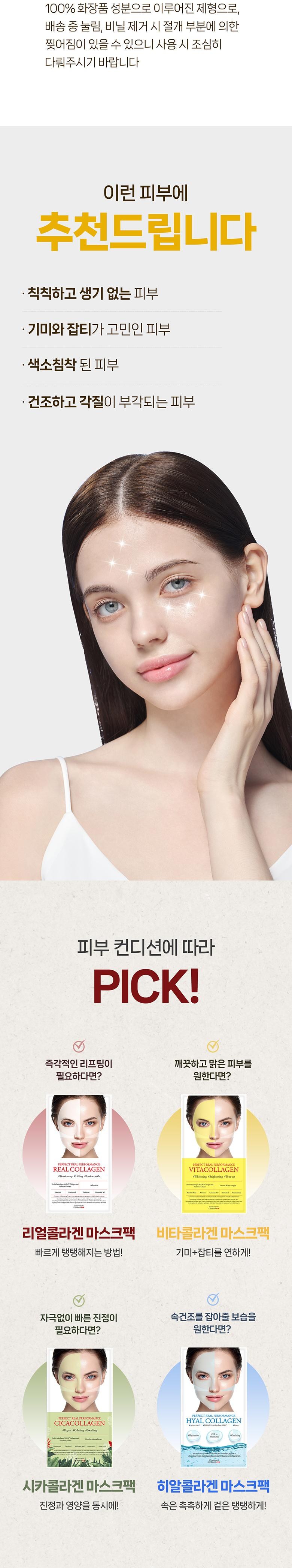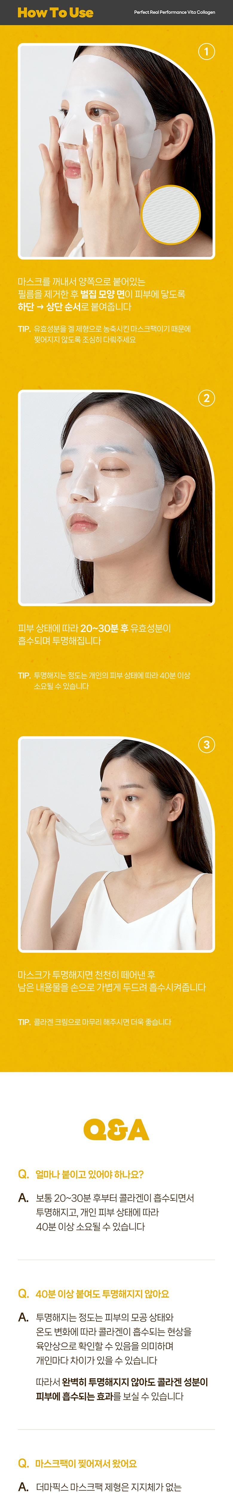 | 사용기한 또는 개봉 후 사용기간 | 제조일로부터 36개월 사용 / 개봉 후 즉시 | 사용방법 | 1. 세안 후, 콜라겐 토너로 피부 결을 정돈한 다음 상/하로 분리된 마스크를 꺼내어 필름을 제거합니다.2. 벌집 모양의 면을 피부 쪽으로 한 후, 하단을 먼저 입 중심으로 상단은 눈 중심으로 얼굴에 맞춰 잘 붙여줍니다.3. 피부 상태에 따라 약 20~30분부터 유효성분이 흡수되면서 투명해집니다.4. 마스크가 투명해지면 떼어낸 후 남은 내용물을 손으로 두드려 흡수시켜 줍니다. |