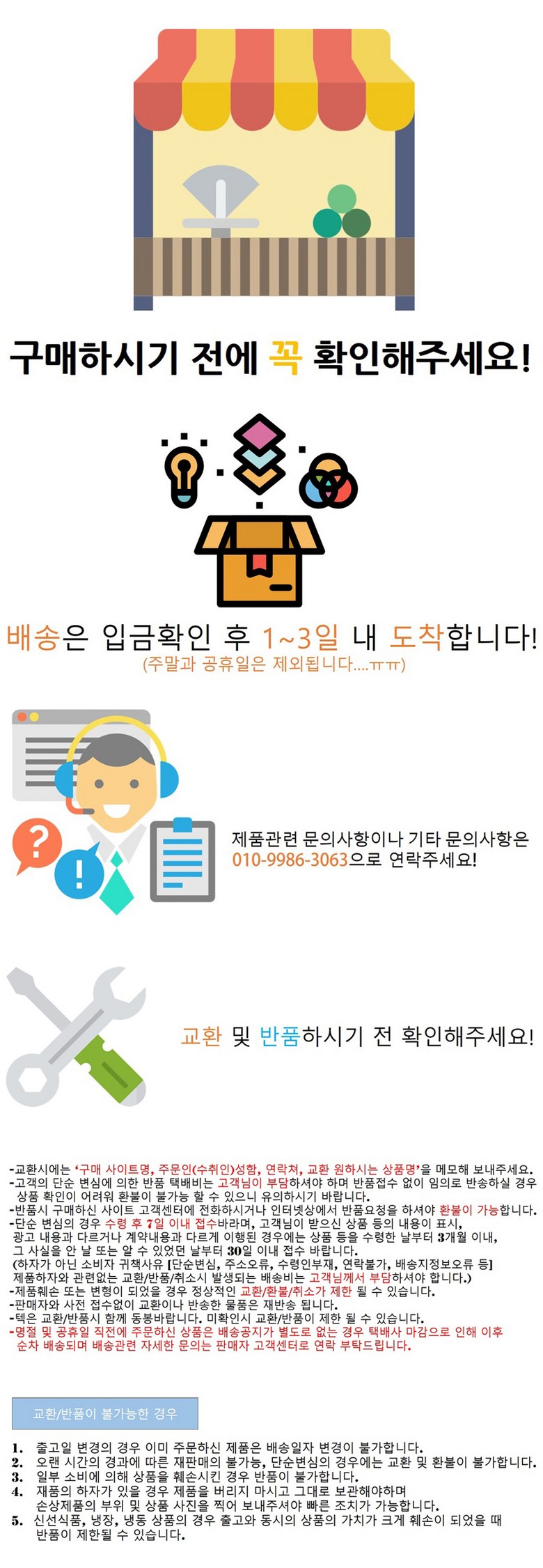 - ㆍ모니터 해상도의 차이로 인해 색상이나 이미지가 실제와 달라, 고객이 단순 변심으로 교환/반품을 무료로 요청하는 경우