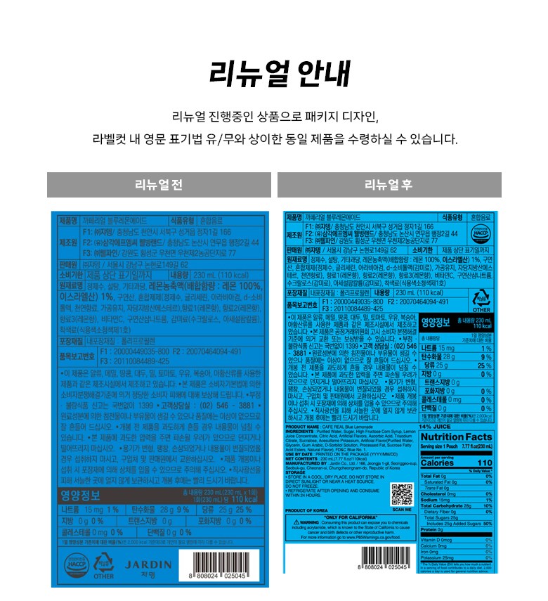 | 포장단위별 내용물의 용량(중량), 수량 | 230ml x 30개 | 원재료명 및 함량 | 컨텐츠 참조 |