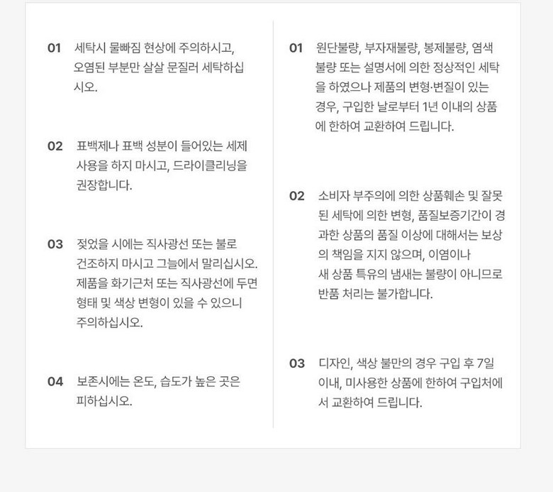 | 제조국 | 중국 | 취급시 주의사항 | 제품에 표시되어있는 섬유혼용율 및 세탁방법을 확인하여주십시오. |