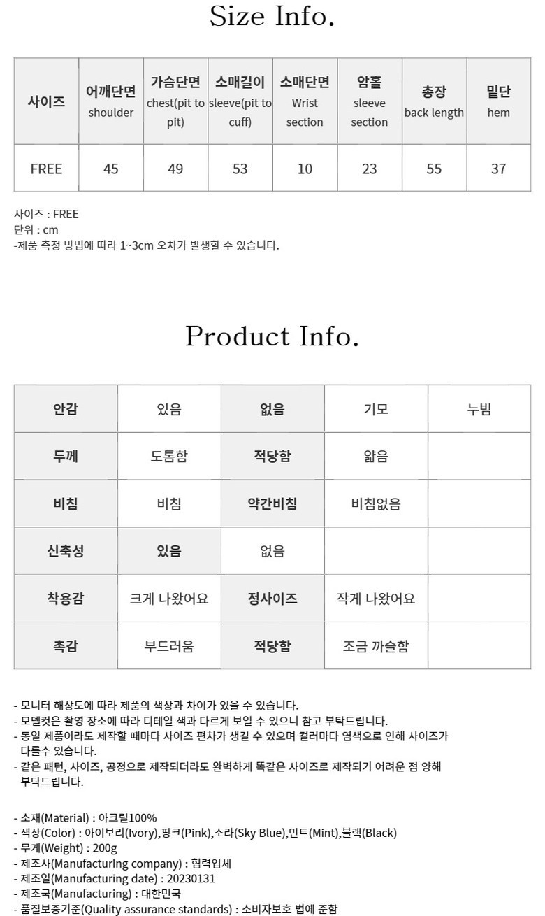 | 제조국 | 대한민국 | 세탁방법 및 취급시 주의사항 | 손세탁 권장 |