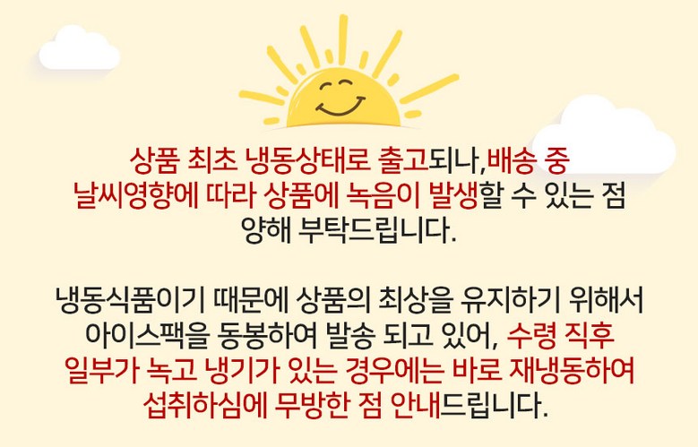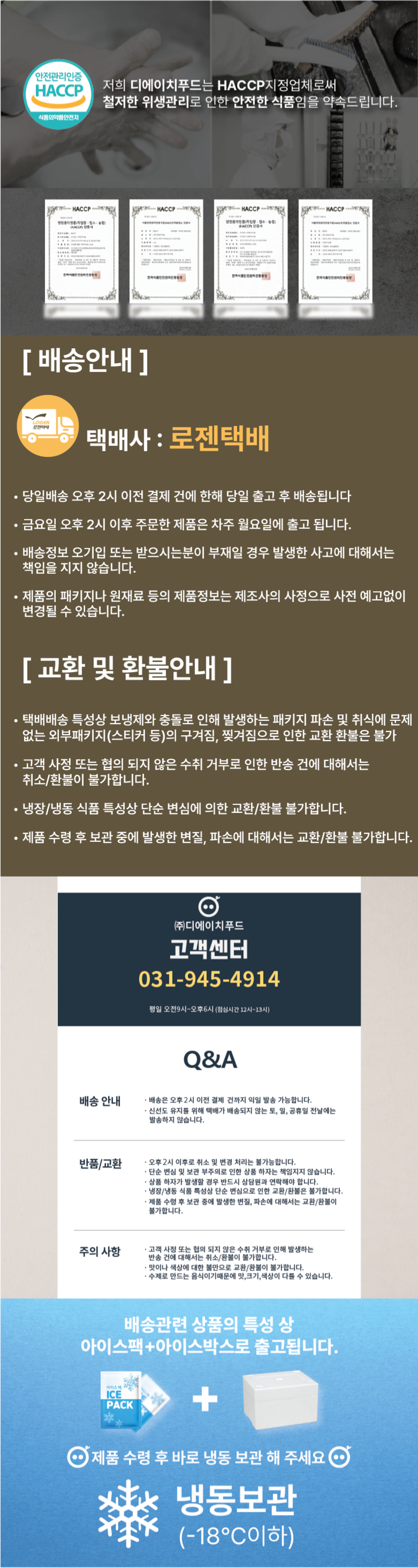 | 배송방법 | 신선/냉장/냉동 | 배송비 | 무료배송 · 도서산간 추가 배송비 - 제주 지역: 3,500원 - 도서산간 지역: 1,000원 |
