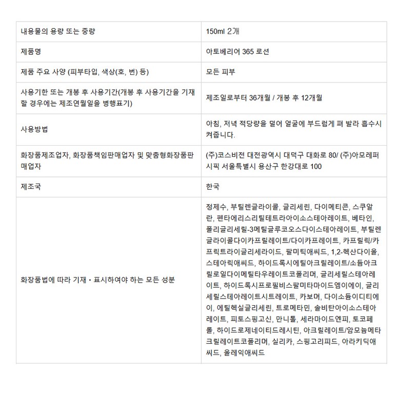 | 화장품제조업자, 화장품책임판매업자 및 맞춤형화장품판매업자 | 상품 상세페이지 참조 | 제조국 | 상품 상세페이지 참조 |