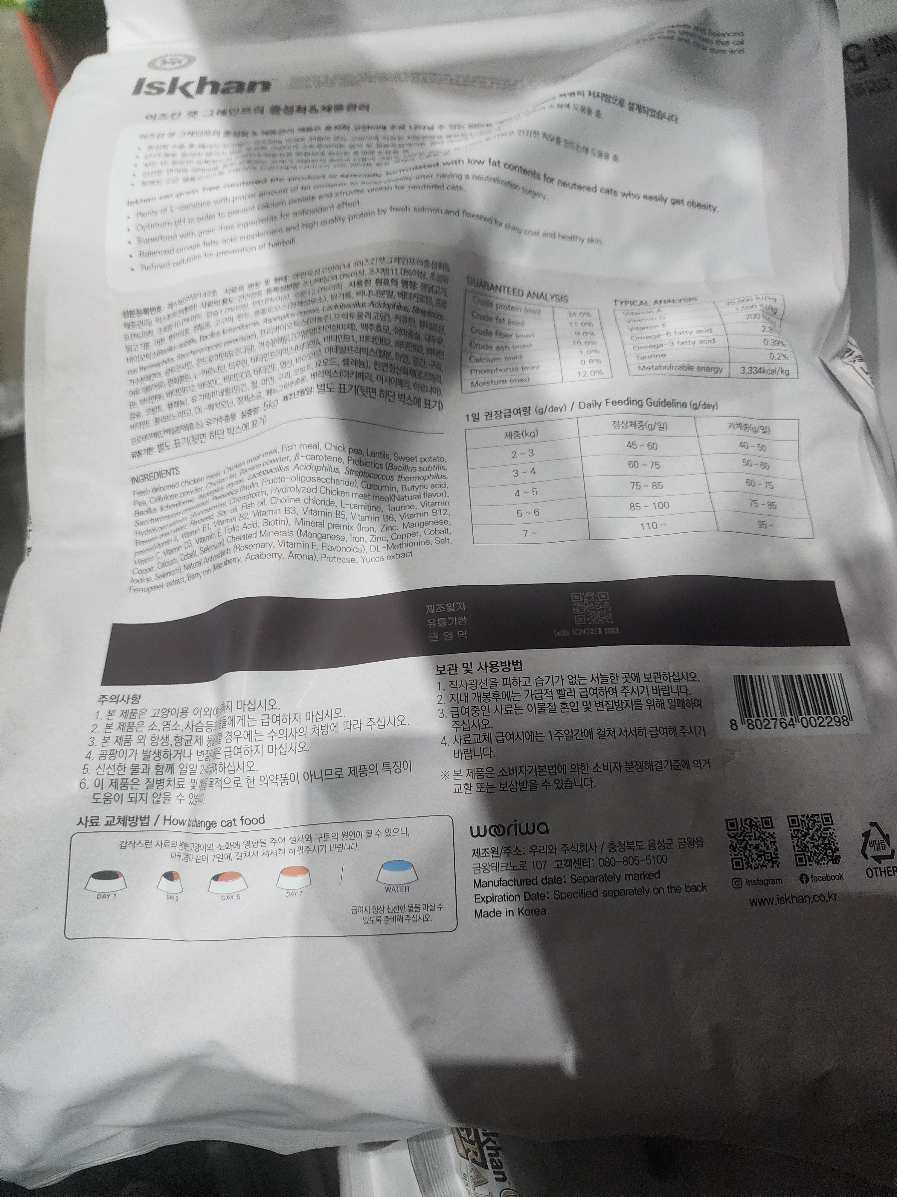| 품명 및 모델명 | 이즈칸 캣 그레인프리 중성화체중관리 | 인증/허가 사항 | 사료관리법에 따른 성분등록번호 : 컨텐츠 참조 |
