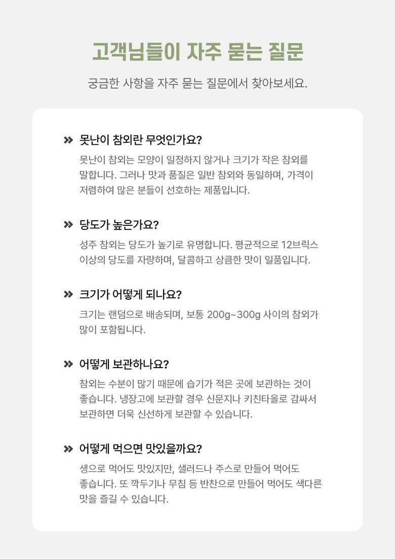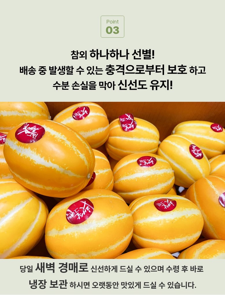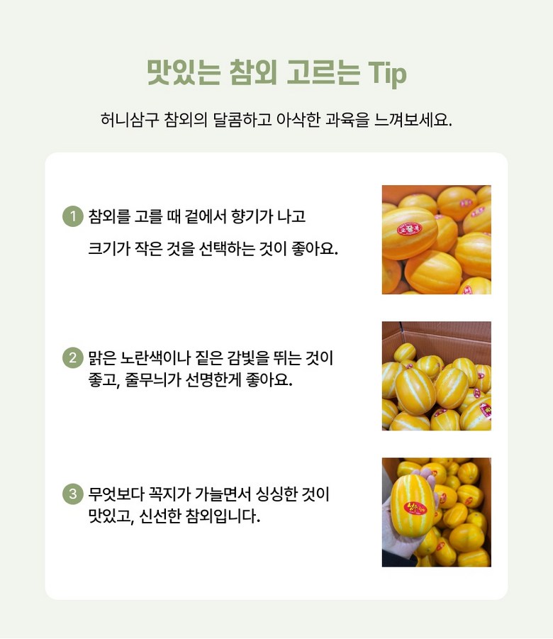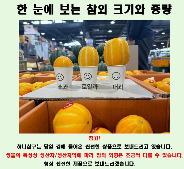 | 품목 또는 명칭 | 과일/참외 | 포장단위별 내용물의 용량(중량),수량,크기 | 2.5kg.5kg,10kg |