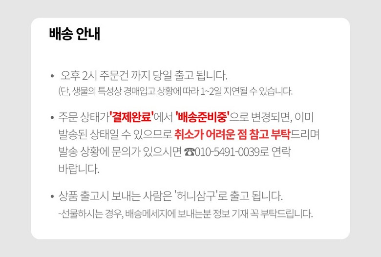 | 제조연월일, 소비기한 또는 품질유지기한 | 생산년도:제조연월일: 주문일로부터3일이내 유통기한: | 세부 품목군별 표시사항 | <농산물>1) 유전자 변형농산물 표시 -2) 지리적표시 -<수산물> 1) 유전자 변형수산물 표시 -2) 지리적표시 -<축산물>1) 등급 표시 -2) 이력관리 표시 유무 - |