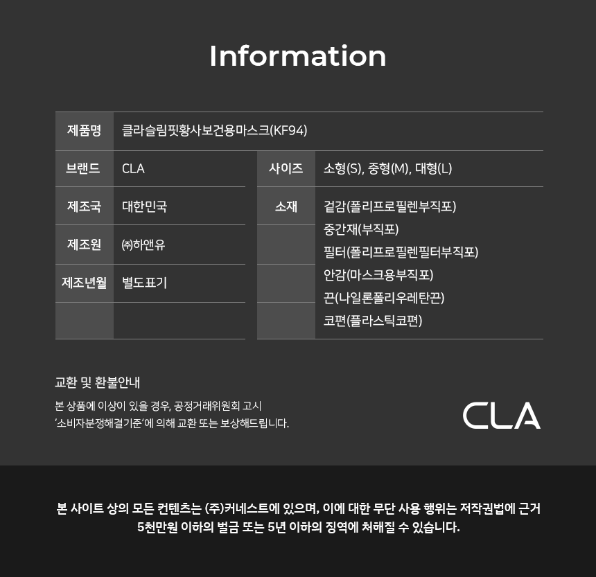 | 품명 및 모델명 | 클라슬림핏보건용마스크(KF94)(검정색)(중형) | 인증/허가 사항 | 의약외품 |