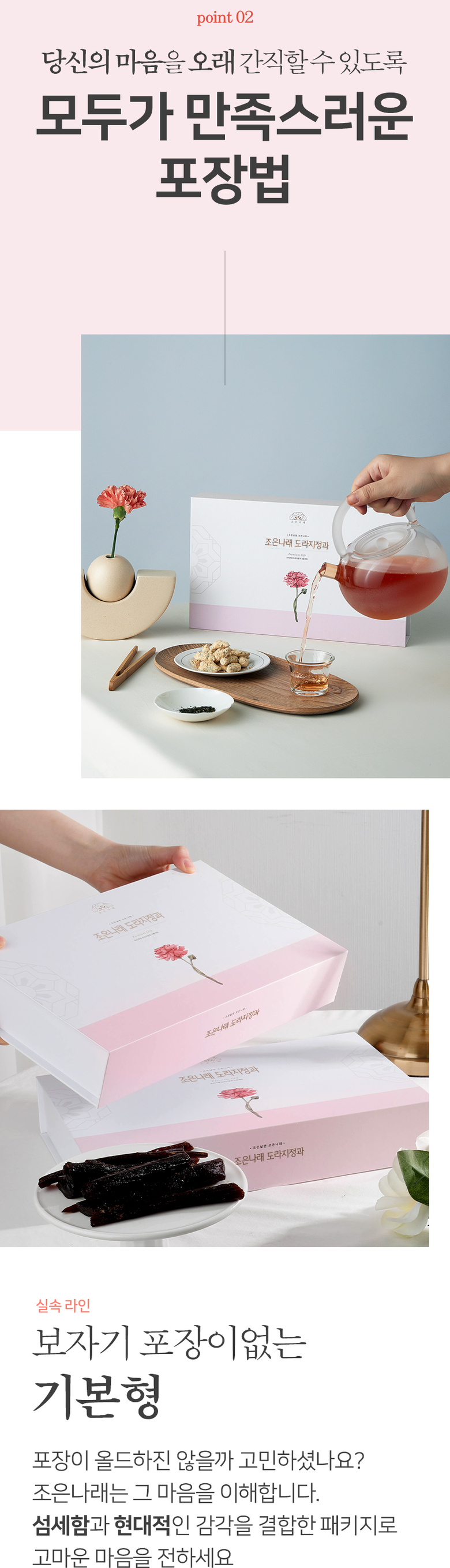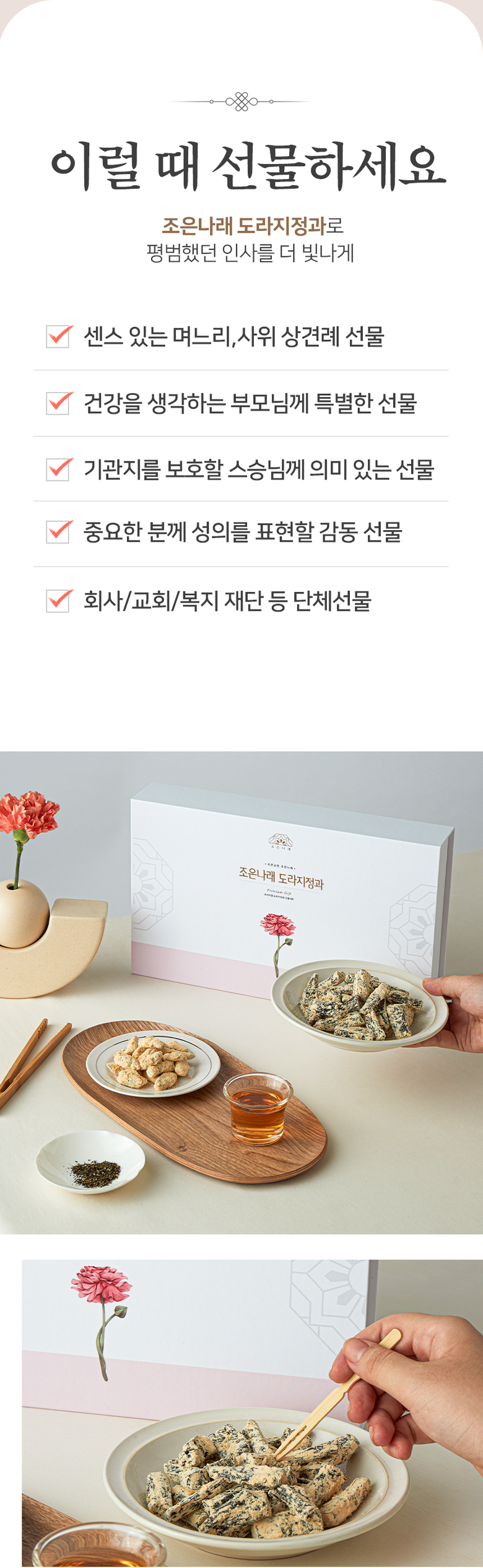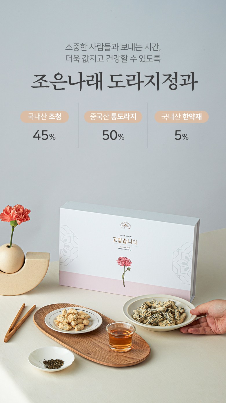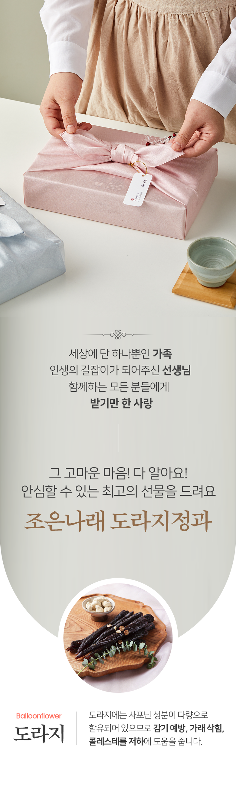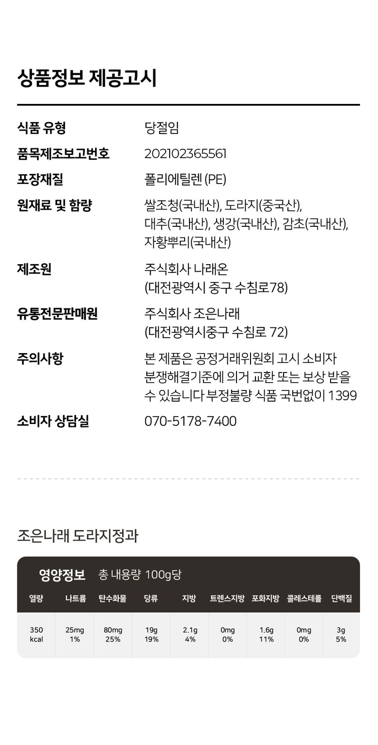 | 포장단위별 내용물의 용량(중량), 수량 | 기본형 : 조은나래 도라지정과 1000G*1개,1개 / 그 외 : 조은나래 도라지정과 1000G*1개 + 콩가루 20G*1개,1개 | 원재료명 및 함량 | 상품 상세페이지 참조 |