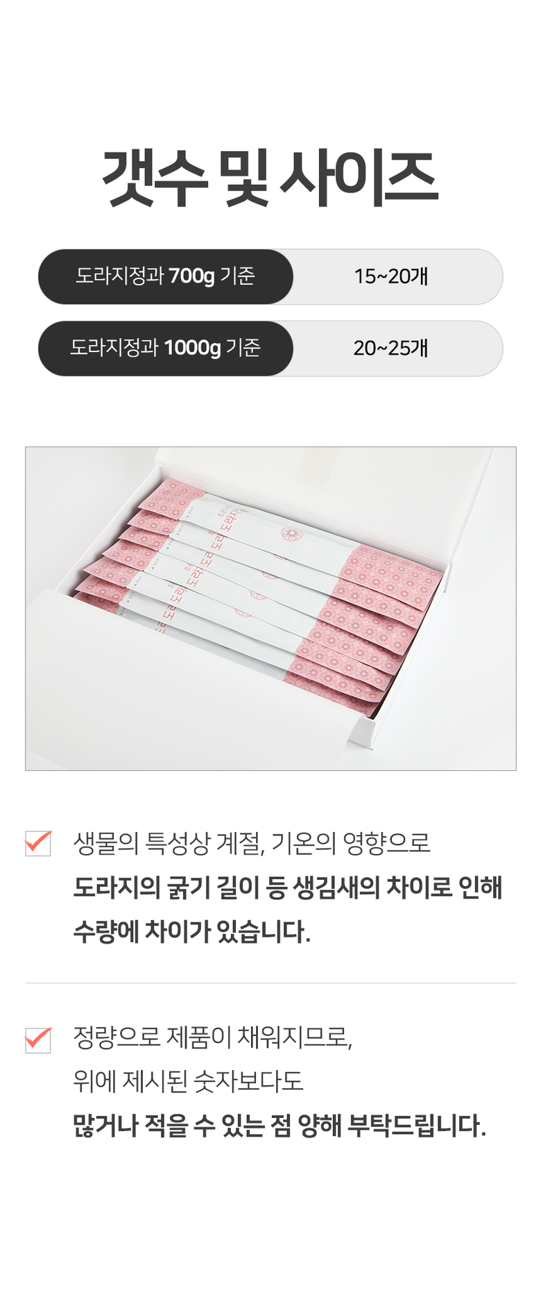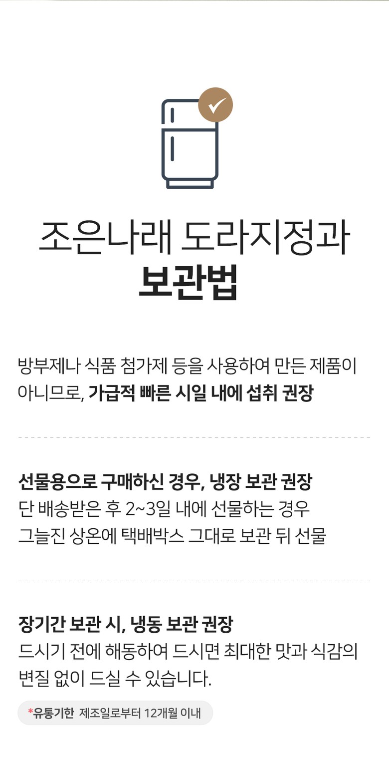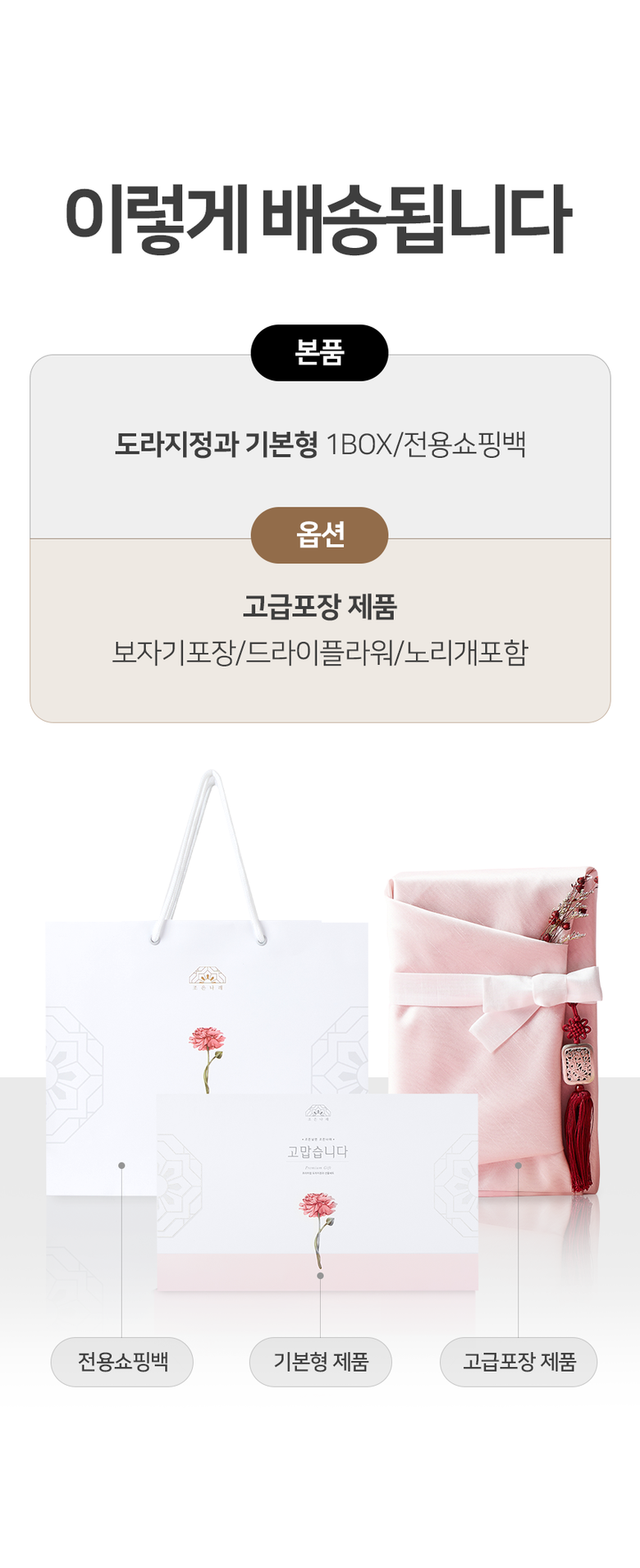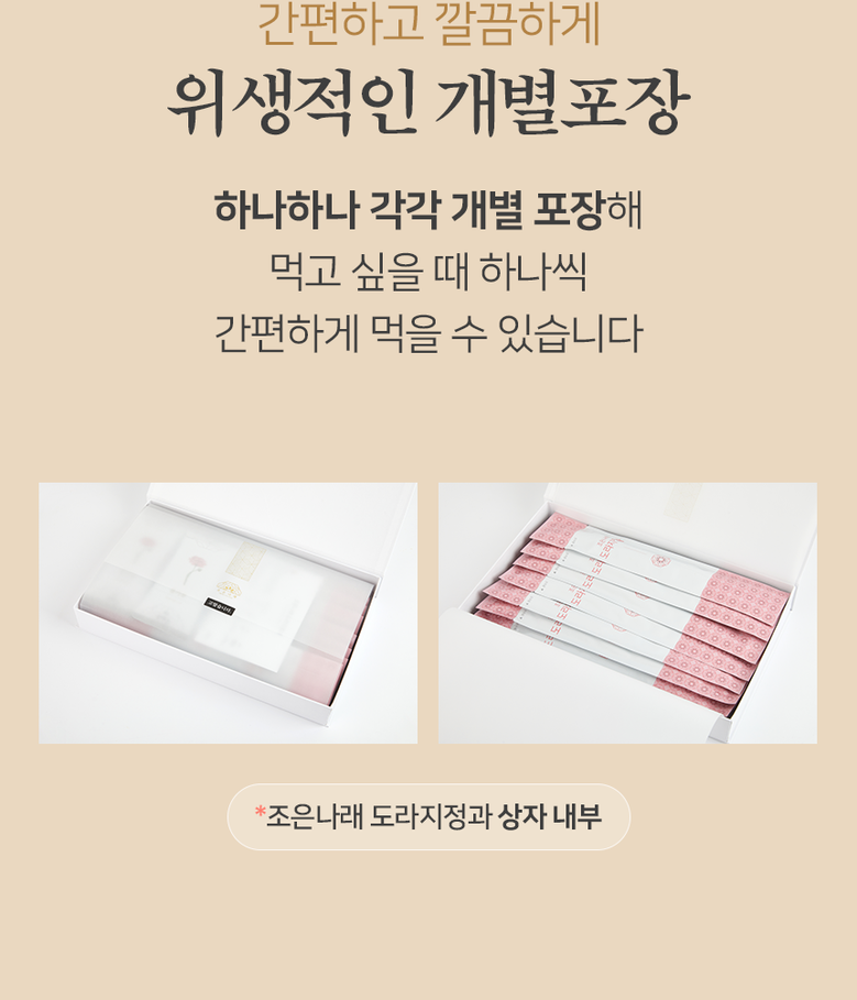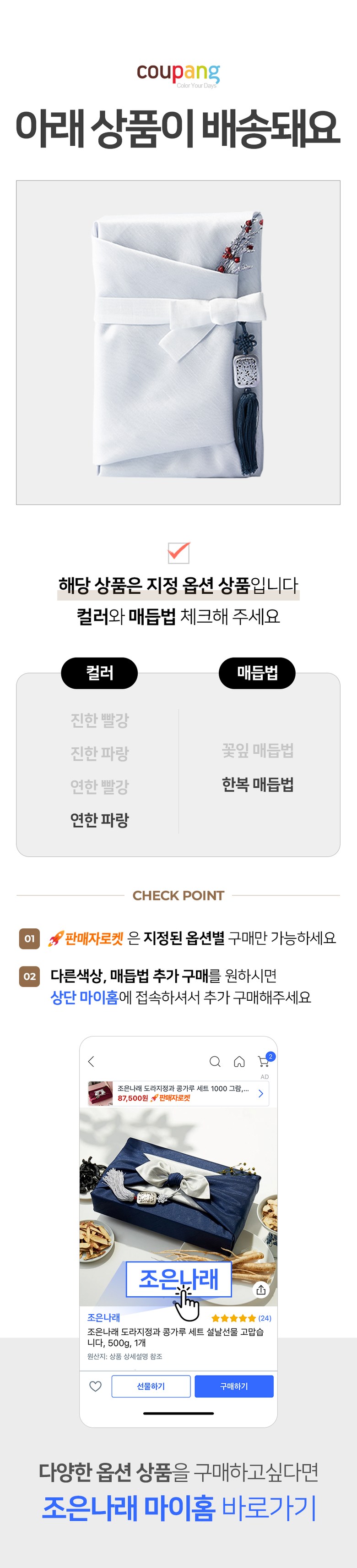| 포장단위별 내용물의 용량(중량), 수량 | 기본형 : 조은나래 도라지정과 1000G*1개,1개 / 그 외 : 조은나래 도라지정과 1000G*1개 + 콩가루 20G*1개,1개 | 원재료명 및 함량 | 상품 상세페이지 참조 |