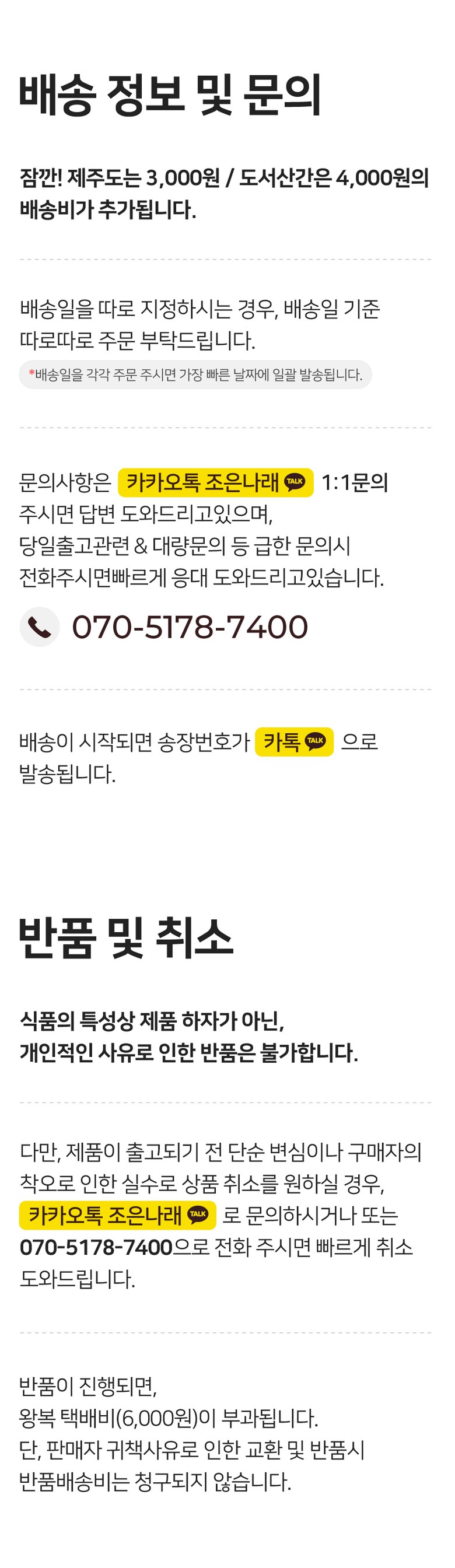 - 상품문의 및 후기게시판을 통해 취소나 환불, 반품 등은 처리되지 않습니다.