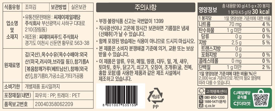 | 제품명 | 비비고 직화 참기름김 | 식품의 유형 | 조미김 |