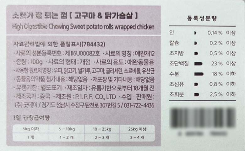 | 품명 및 모델명 | 소화가 잘되는 껌 [고구마&닭가슴살] | 인증사항 | 사료관리법에 따른 성분등록번호 : 컨텐츠 참조 |