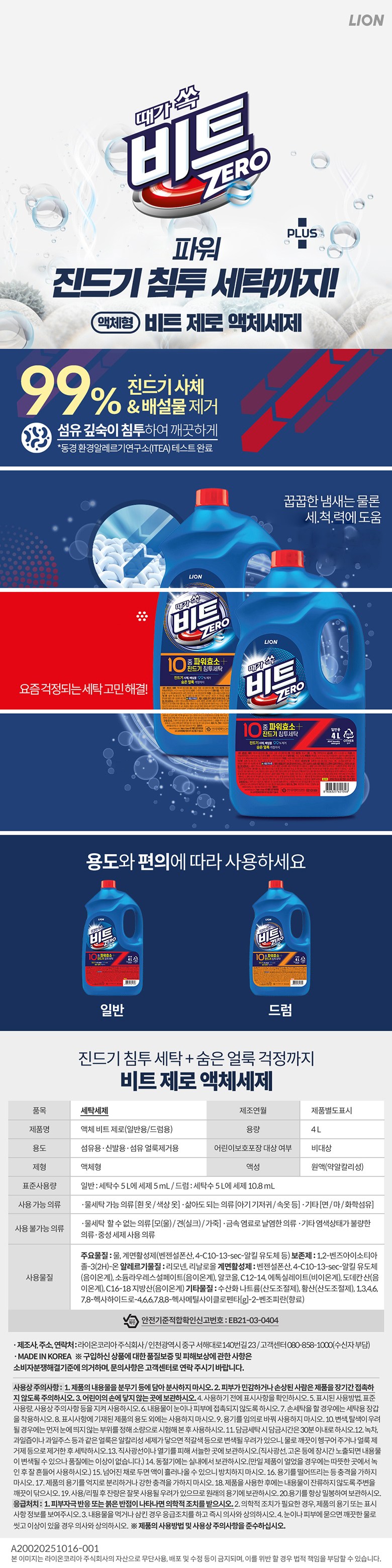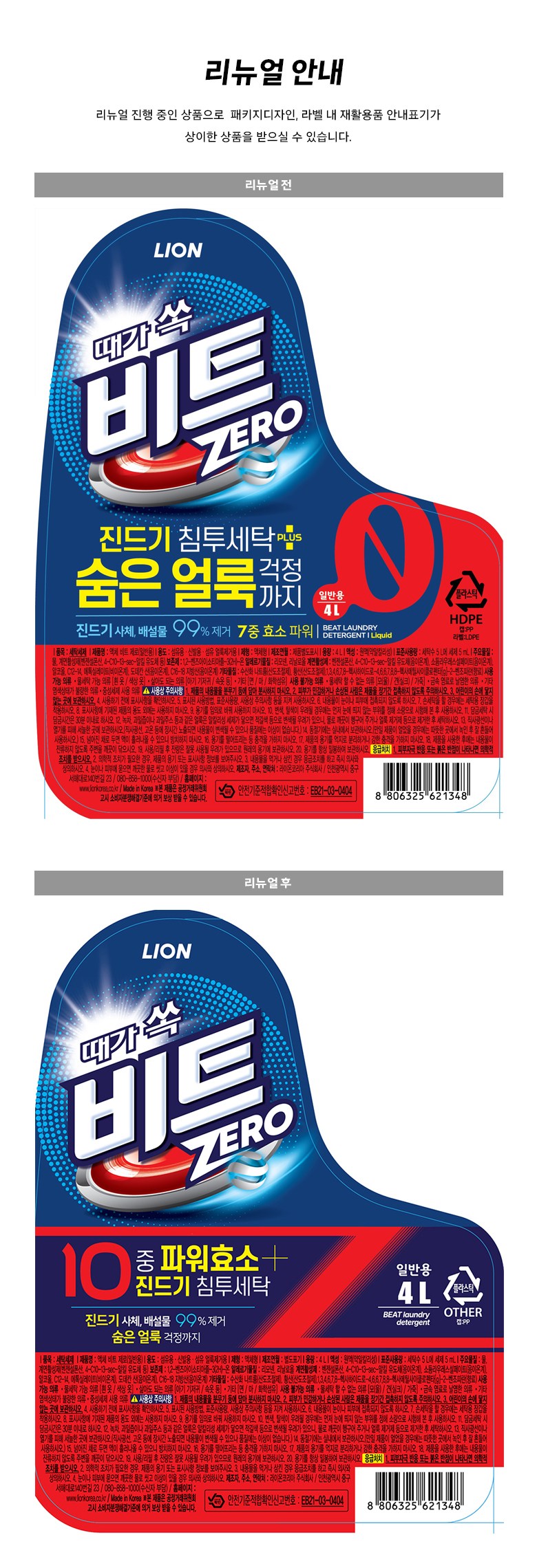 | 품목 및 제품명 | 세탁세제/액체 비트제로 (일반용) | 용도(표백제의 경우 계열을 함께표시) 및 제형 | 섬유용, 신발용, 섬유얼룩제거용/액체형 |
