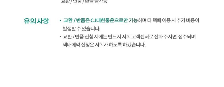 | 교환/반품 신청 기준일 | ㆍ단순변심에 의한 교환/반품은 제품 수령 후 7일 이내까지, 교환/반품 제한사항에 해당하지 않는 경우에만 가능 (배송비용과 교환/반품 비용 왕복배송비 고객부담) ㆍ상품의 내용이 표시·광고의 내용과 다른 경우에는 상품을 수령한 날부터 3개월 이내, 그 사실을 안 날 또는 알 수 있었던 날부터 |
