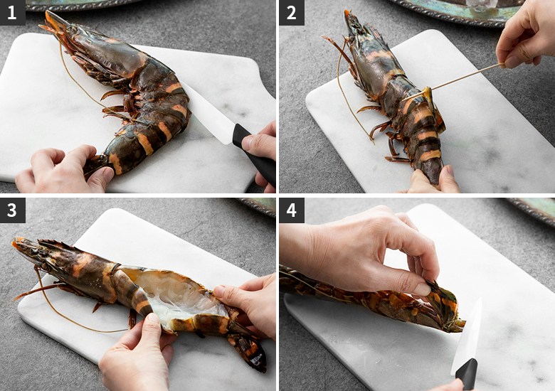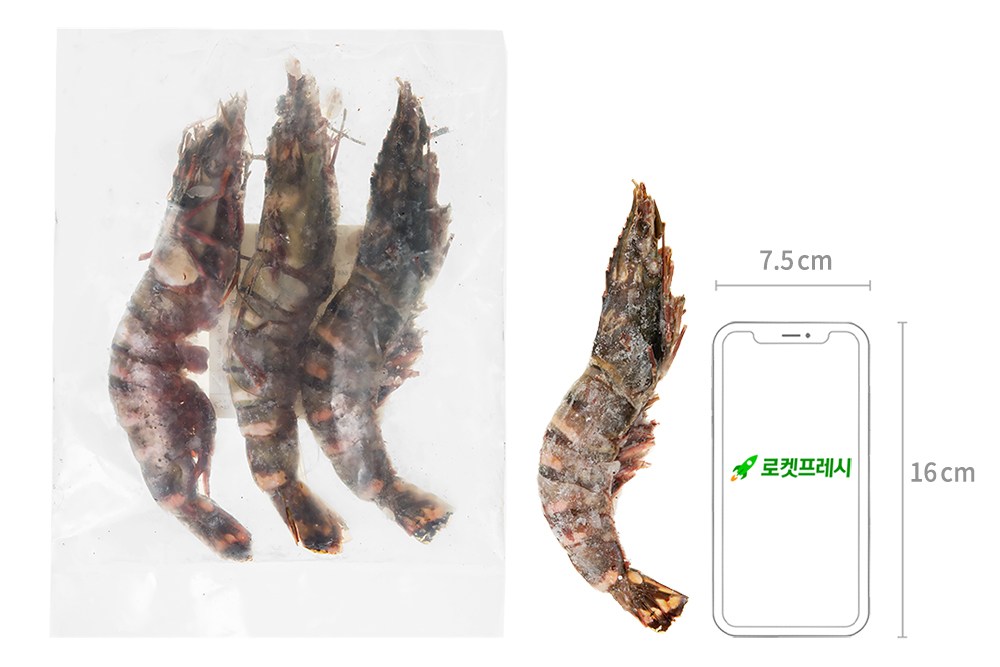 등 부분을 칼로 잘라 내장을 제거해주세요. 꼬리 부분의 물총도 제거한 뒤 조리해주세요. 킹타이거새우는 크기가 굉장히 큽니다. 손과 비교했을 때의 크기와 함께 하단의 휴대폰 비교 사이즈도 꼭 확인해보세요.