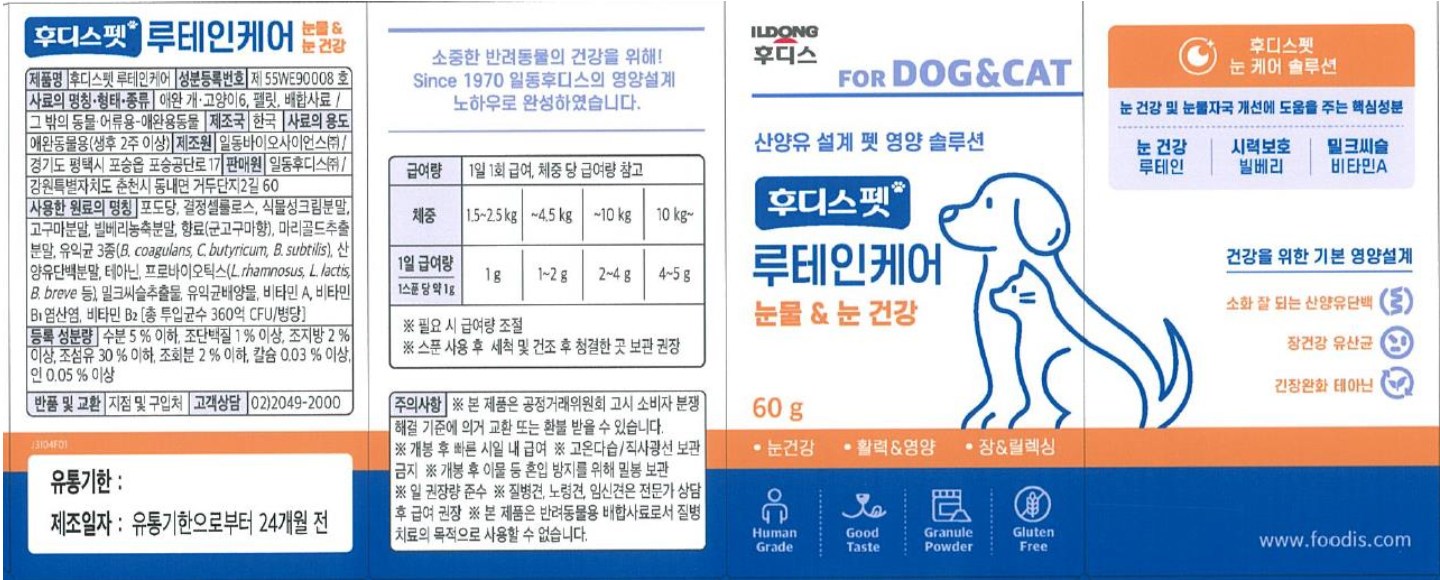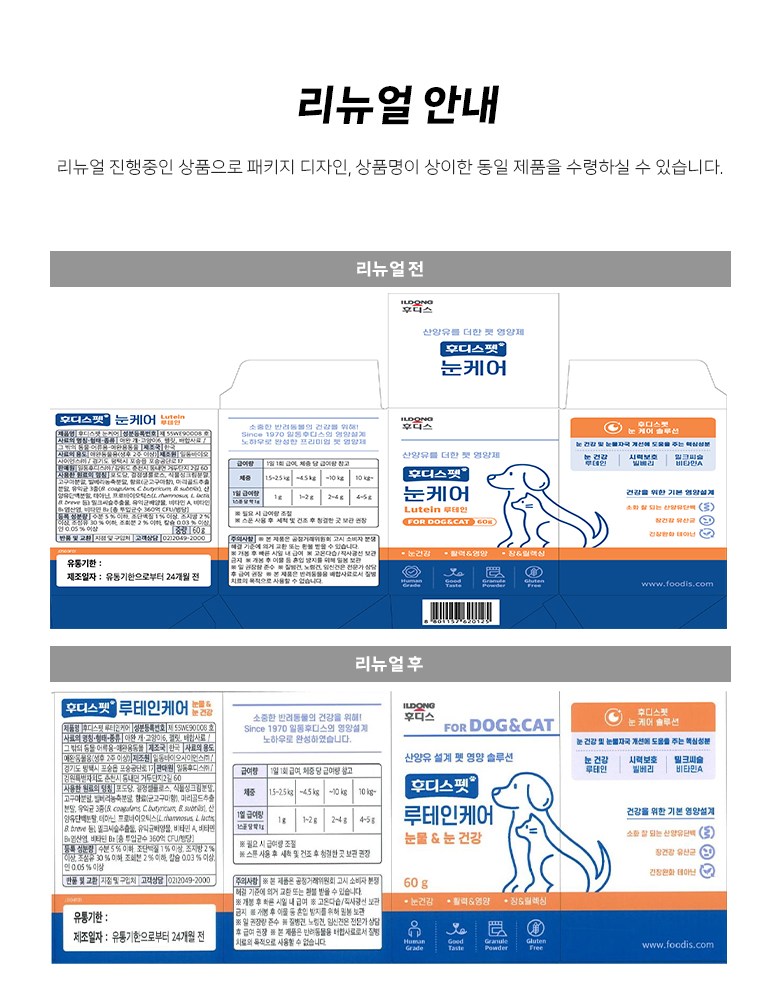 | 품명 및 모델명 | 후디스펫 루테인케어 영양제 | 인증/허가 사항 | 사료관리법에 따른 성분등록번호 : 컨텐츠 참조 |