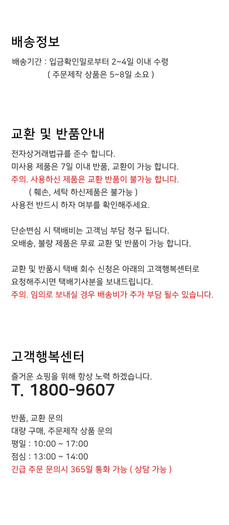 - ㆍ모니터 해상도의 차이로 인해 색상이나 이미지가 실제와 달라, 고객이 단순 변심으로 교환/반품을 무료로 요청하는 경우